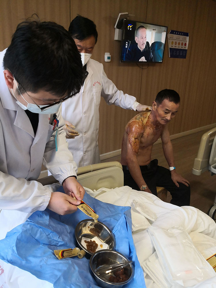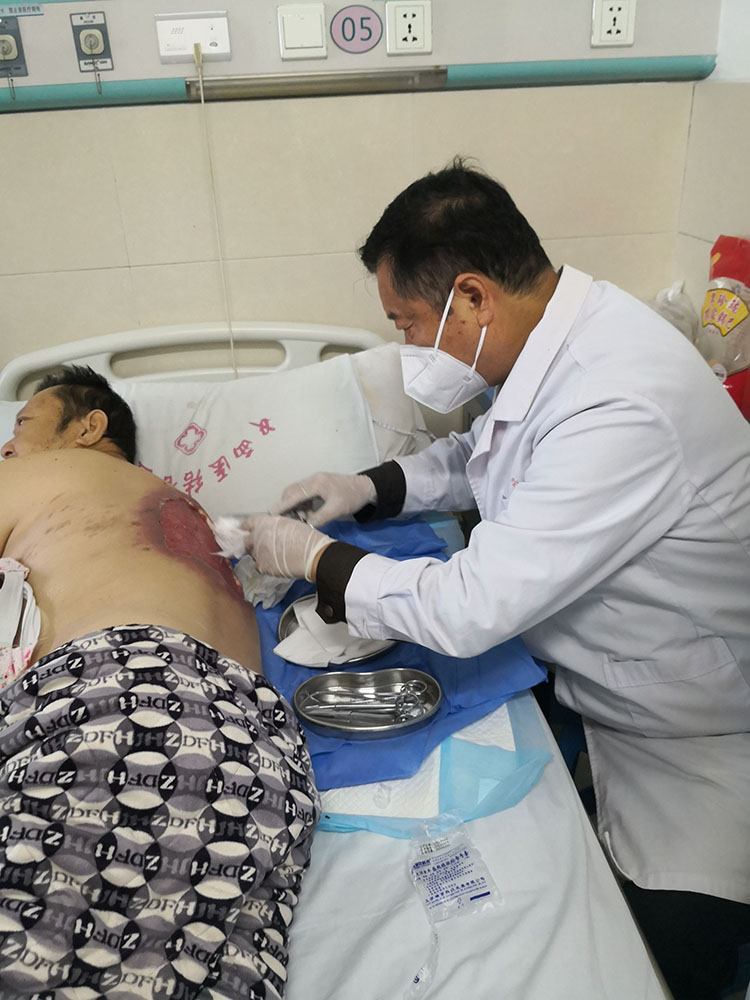 2022年11月22日,中國中西醫(yī)結(jié)合學(xué)會燒傷專業(yè)委員會醫(yī)療部張強主任應(yīng)邀前往滁州市中西醫(yī)結(jié)合醫(yī)院和安徽涵博健康集團醫(yī)院,對一例背部巨大潰瘍患者和一例燒傷患者進行會診,現(xiàn)場講解指導(dǎo)應(yīng)用再生醫(yī)療技術(shù)處理創(chuàng)面及換藥方法,并就2例患者后期的治療與主管醫(yī)生進行了交流。