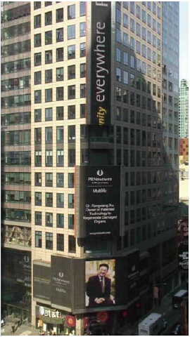 徐:2013年中期,應(yīng)世界形式之需,我在全球公開了人類再生生命的秘密及人體再生復(fù)原科學(xué)在器官再生、頑疾復(fù)原、生命還童等領(lǐng)域的實(shí)際成果。當(dāng)時(shí),美通社、路透社、中新社等多家世界主流媒體,以各種語言向全球作了發(fā)布,紐約時(shí)代廣場(chǎng)七次刊登了相關(guān)信息,掀起了器官再生科學(xué)在全世界的熱潮,更激起了世界數(shù)十億人民對(duì)此成果的期盼,潛能再生細(xì)胞等專利被關(guān)注更達(dá)億次計(jì)數(shù)。我認(rèn)為這代表了人類對(duì)新科學(xué)的敏銳與向往,我沒有壓力,而是高興,這比我想像的新科學(xué)被人類應(yīng)用快了一個(gè)世紀(jì)。