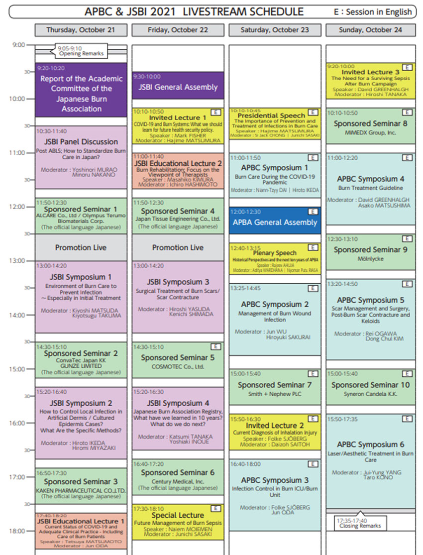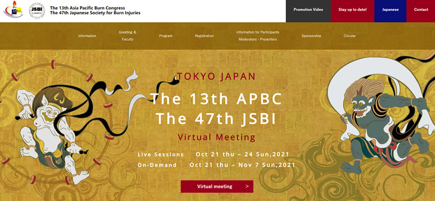 2021年10月21日至10月24日,第13屆亞太燒傷會(huì)議(APBC 2021)暨日本燒傷學(xué)會(huì)(JSBI)第47屆年會(huì)以虛擬會(huì)議的形式舉行。亞太燒傷會(huì)議是國際燒傷會(huì)議日歷上的一項(xiàng)重要活動(dòng),它匯聚了來自各國的醫(yī)生、護(hù)士及科研人員等,為全球醫(yī)務(wù)工作者分享臨床治療經(jīng)驗(yàn)、最新研究成果和臨床管理方法提供了一個(gè)寶貴的平臺(tái)。本屆大會(huì)的主題為“燒傷治療的下一次動(dòng)態(tài)變化——應(yīng)對(duì)感染、預(yù)防和控制感染”(The Next Dynamic Change in Burn Care – Coping with Infection, Infection Prevention and Control)。