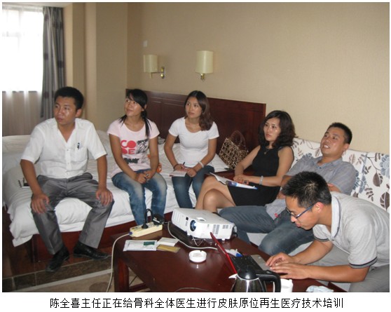 2012年8月28 日,中國中西醫(yī)結(jié)合學(xué)會燒傷專業(yè)委員會委員、北京美寶燒傷創(chuàng)瘍研究所臨床部專家陳全喜主任和賀杰鋒應(yīng)商丘市第三人民醫(yī)院醫(yī)政科科長兼骨科主任李季然的邀請,在骨科舉辦皮膚原位再生醫(yī)療技術(shù)培訓(xùn)班。