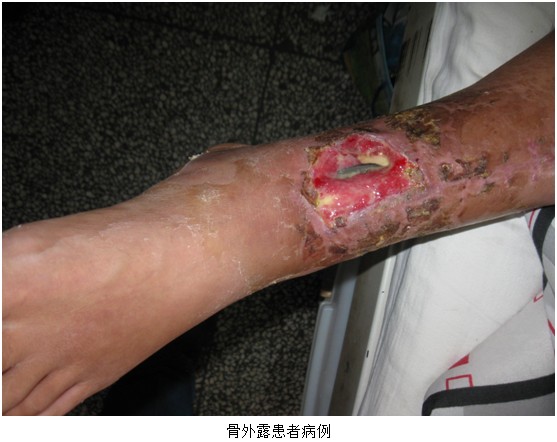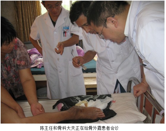 該院骨科有兩位骨外露患者已術(shù)后多日,傷口不愈合,請陳主任會診:第一例病人張某,男,半年前因車禍造成左小腿粉碎性骨折,手術(shù)后半年傷口不愈合,骨和鋼板暴露;第二例病人王某,男,右足跟部被汽車軋傷,踝骨骨折,手術(shù)后傷口不愈合96天。會診后陳全喜主任結(jié)合兩個病人進行了病情分析,接著系統(tǒng)講述了皮膚原位再生醫(yī)療技術(shù),并把治療的骨外露的病例進行了展示??剖伊淮蠓蚵犃似つw原位再生醫(yī)療技術(shù)和看到的治療病例,很是欽佩。主任李季然說:“陳主任,在您的指導(dǎo)下,讓這兩位病人應(yīng)用皮膚原位再生醫(yī)療技術(shù)治療,讓我們學(xué)習(xí)吧” 。