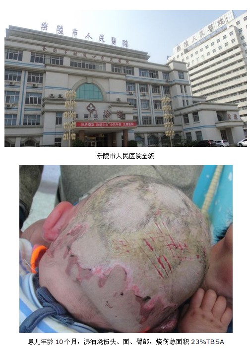 樂(lè)陵市人民醫(yī)院燒傷科于2011年4月25日接收了1名頭皮沸油燒傷小兒患者,該院高院長(zhǎng)、燒傷科吳主任非常重視,與燒傷科魯國(guó)軍醫(yī)生一同為患兒采用再生醫(yī)療技術(shù)治療,治療1天后,該患兒兩眼瞼腫脹,頭皮創(chuàng)面蒼白,痂皮硬,小兒哭鬧。北京市燒傷創(chuàng)瘍研究所醫(yī)療部專(zhuān)家王廣順教授當(dāng)時(shí)正在濟(jì)南106醫(yī)院為蒙古國(guó)右足凍傷小伙治療,在接到該院領(lǐng)導(dǎo)的邀請(qǐng)后立即與徐亞磊同志一起乘車(chē)趕到該院進(jìn)行技術(shù)指導(dǎo)。下午6點(diǎn),王廣順教授在該院燒傷科吳主任、魯大夫及護(hù)士長(zhǎng)的陪同下來(lái)到病房,見(jiàn)患兒年齡僅10個(gè)月,沸油燒傷頭面、臀部,燒傷總面積23%TBSA。王廣順教授親自應(yīng)用再生復(fù)原醫(yī)療技術(shù)為患者換藥,頭皮Ⅲ度創(chuàng)面采用“耕耘療法”,通過(guò)涂藥等局部治療后,又進(jìn)一步調(diào)整了全身治療方案。次日換藥治療時(shí)察看該患兒頭皮Ⅲ度創(chuàng)面,已見(jiàn)耕耘處紅暈、新鮮有彈性。