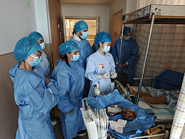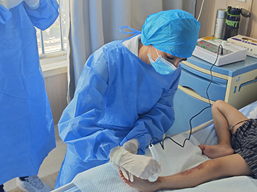 交流會(huì)結(jié)束后,代表團(tuán)前往燒傷整形中心病區(qū)進(jìn)行觀摩,深入了解了天然氣爆炸造成的大面積燒傷患者、熱水泥導(dǎo)致的頭面部燒傷患者等的治療流程。代表團(tuán)積極協(xié)助創(chuàng)面??谱o(hù)士進(jìn)行換藥,通過實(shí)踐操作及床旁講解更加清晰地了解到換藥過程中的操作要點(diǎn),以及再生醫(yī)療技術(shù)聯(lián)合多技術(shù)治療的優(yōu)勢。