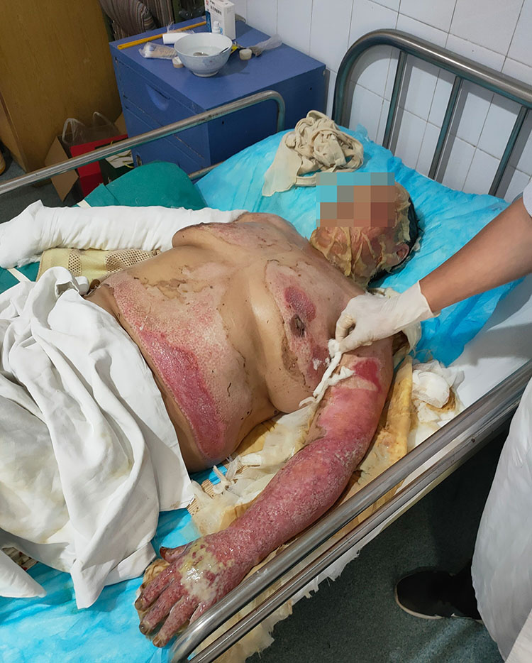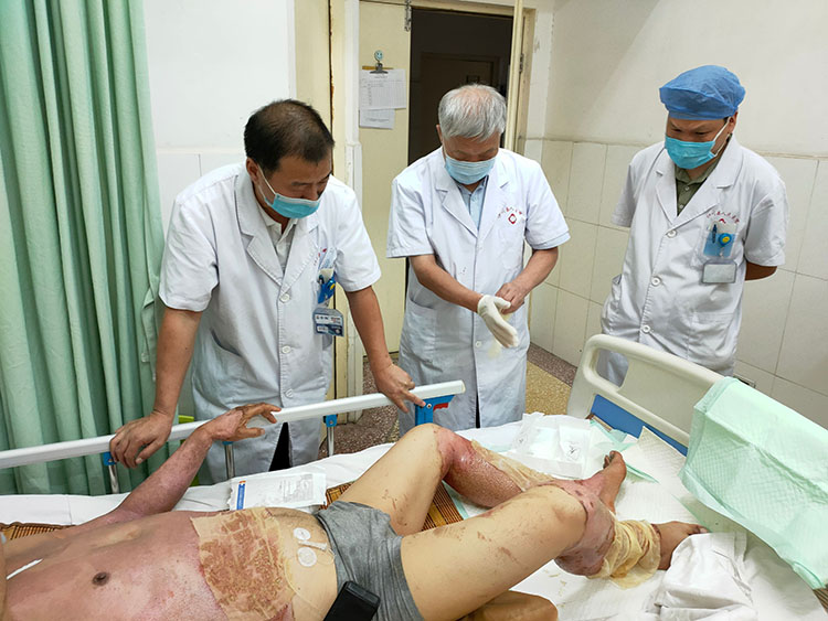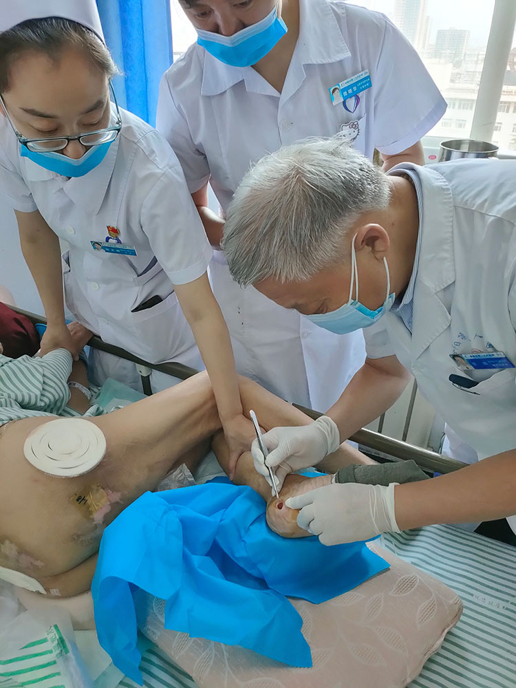 13日,金教授來到洛陽第十人民醫(yī)院創(chuàng)面修復(fù)科,對科室收治的糖尿病液化氣爆炸傷病人進(jìn)行查房換藥,對科室的燒傷治療效果給予肯定。