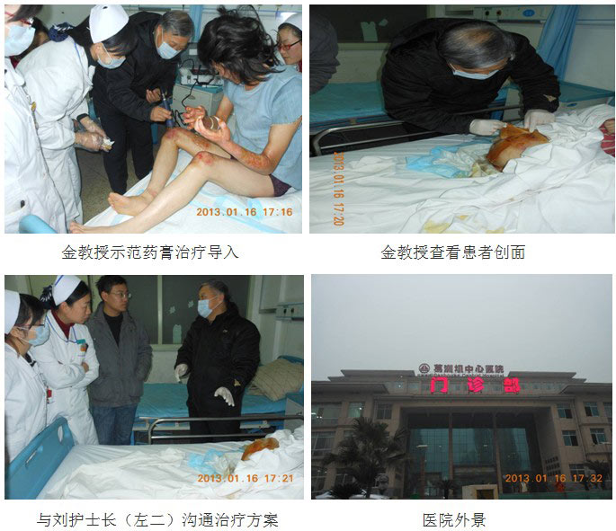 培訓(xùn)結(jié)束后,劉護(hù)士長請金教授會診了兩位患者:一位是磷燒傷患者,住院兩個多月,使用濕潤燒傷膏暴露療法治療,效果理想。部分愈合創(chuàng)面要做防疤治療,金教授現(xiàn)場示范了疤痕軟膏結(jié)合超聲波導(dǎo)入的操作;另一位是較大面積老年褥瘡患者,有帕金森氏癥,針對創(chuàng)面的處理,金教授與劉護(hù)士長溝通了濕潤燒傷膏油紗制作換藥的細(xì)節(jié)。
