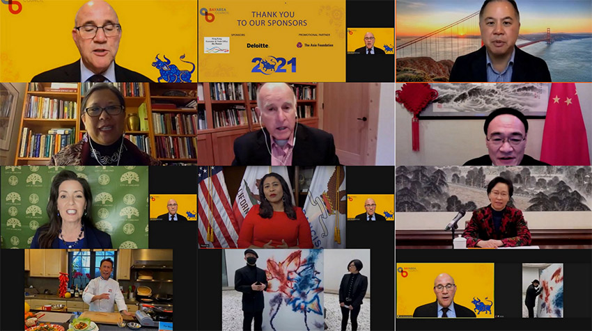 下午5點,新年慶祝活動正式開幕,美國加州政府、中國上海楊浦等各區(qū)政府,以及江蘇省、廣東省、南京市、深圳市、九江市等各省市政府代表參會。中美雙方代表在線祝賀并致辭,共同為中國農(nóng)歷新年送上誠摯的祝福和希冀,大家期待在新的2021年能為建設(shè)更加和諧穩(wěn)定的中美關(guān)系與更美好繁榮的世界而攜手并肩,戮力前行。