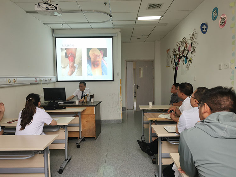6月19日,應(yīng)河北北方學(xué)院附屬第二醫(yī)院邀請(qǐng),《中國(guó)燒傷創(chuàng)瘍雜志》常務(wù)編委、燒傷創(chuàng)瘍?cè)偕t(yī)療技術(shù)臨床專家趙瑞慶,在該院會(huì)診了四例糖尿病足潰瘍患者,會(huì)診后在醫(yī)辦室做了會(huì)診小結(jié),分別給出指導(dǎo)意見,事后又進(jìn)行了再生技術(shù)治療糖尿病足潰瘍的科室培訓(xùn),耐心解答了大家提出的臨床問題,受到大家一致認(rèn)可。