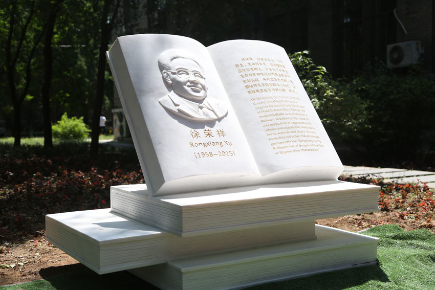 “榮祥樓”牌匾由中國傳統(tǒng)工藝景泰藍精制而成,徐榮祥教授紀念刻石則由通體漢白玉雕刻而成,碑書內容中英文金字鑲刻,高度概括了徐榮祥教授的一生:徐榮祥,山東沾化人,外科醫(yī)生、生命科學家,燒傷濕潤暴露療法發(fā)明人。畢生致力于再生生命科學和燒傷創(chuàng)瘍再生醫(yī)學研究與實踐,并做出杰出貢獻。美國哈佛大學醫(yī)學院永久設立“徐榮祥再生醫(yī)學外科教授”席位。