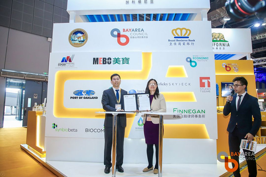 美寶集團總裁楊智斌,副總裁劉鋼、商慶新,灣區(qū)委員會全球倡議副主席兼中國業(yè)務總監(jiān)鄒艷玲(Jennifer Zou)在加州館進博會現(xiàn)場參加了此次儀式。
