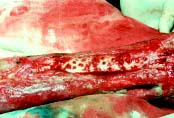 骨組織燒傷創(chuàng)面的處理:對骨暴露先用MEBO保護創(chuàng)面,一周后可將壞死的骨膜、骨皮質(zhì)清除,而后在骨表面用骨鉆按0.5~1厘米孔距鉆孔,深達髓質(zhì),以出血為度,再用MEBO油紗覆蓋創(chuàng)面,每日換藥2~3次,由鉆孔處培養(yǎng)生長肉芽組織,待肉芽組織形成片覆蓋骨組織后植皮封閉創(chuàng)面,或以MEBO原位培養(yǎng)潛能再生細胞再生新的皮膚組織封閉愈合創(chuàng)面。