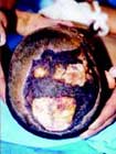 2. 傷后2天清創(chuàng),按骨燒傷的治療方法,對(duì)顱骨鉆孔(穿透外板)外敷MEBO治療。