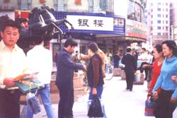 溫州位于浙江南部,甌江從這里流入東海,以“控江帶海,利兼水陸”之勢成為浙南物資集散中心。唐宋時已為對外貿(mào)易港口,1876年被辟為通商口岸,為中國著名僑鄉(xiāng)。溫州五馬街古稱五馬坊,東晉王羲之為永嘉(現(xiàn)溫州)郡守出乘五馬而得名。如今,這里是溫州最為繁華的步行街,每天都有成千上萬的游客從這里經(jīng)過,恰逢十六大召開之際,溫州地區(qū)所有業(yè)務(wù)人員來到這里熱情地向過往行人發(fā)放美寶宣傳品,大家非常認(rèn)真地詢問產(chǎn)品的使用情況。此時此刻,美寶產(chǎn)品的宣傳活動為十六大的勝利召開增添了絢麗的色彩。