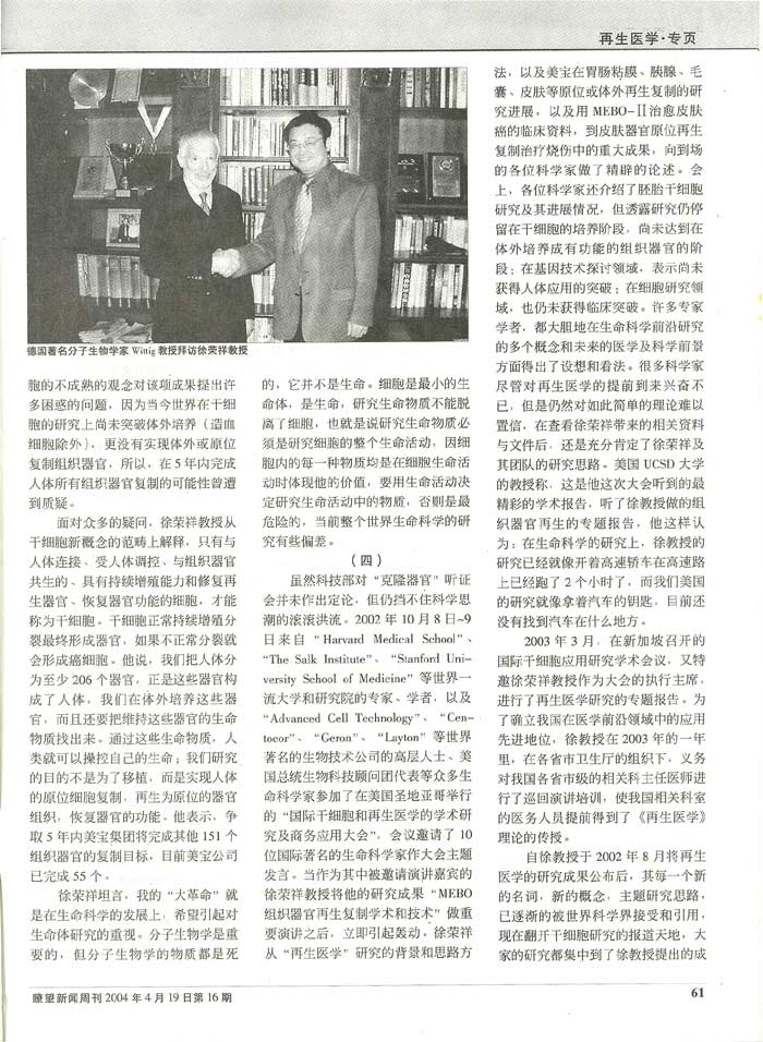 徐榮祥:《再生醫(yī)學(xué)》叩啟生命之門 瞭望 新聞周刊 2004年4月19日 |