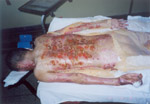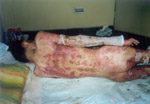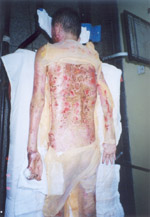 傷后半年,全身遺留藥15%殘創(chuàng)未愈,創(chuàng)面用利福平紗布濕敷