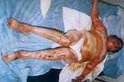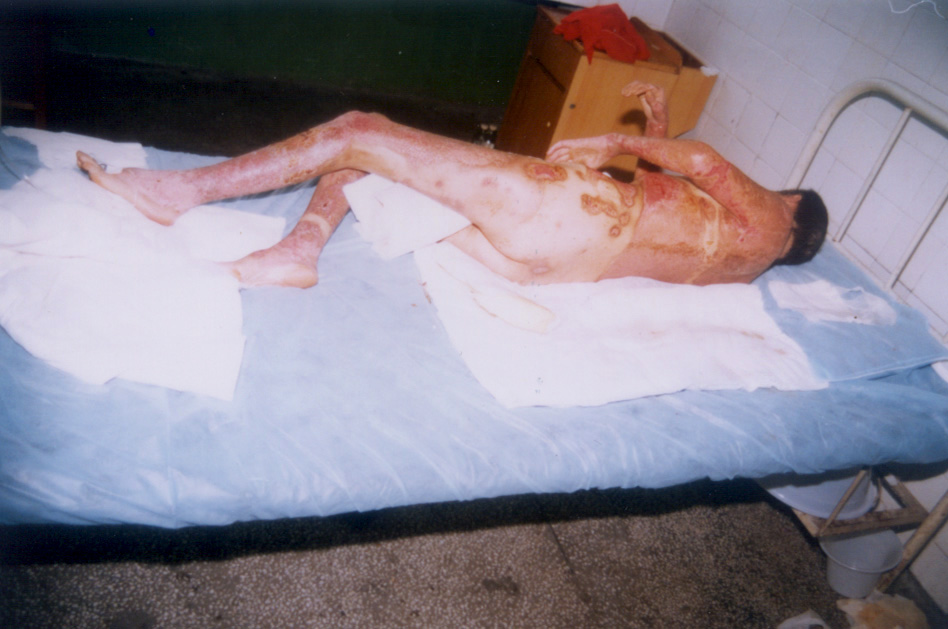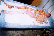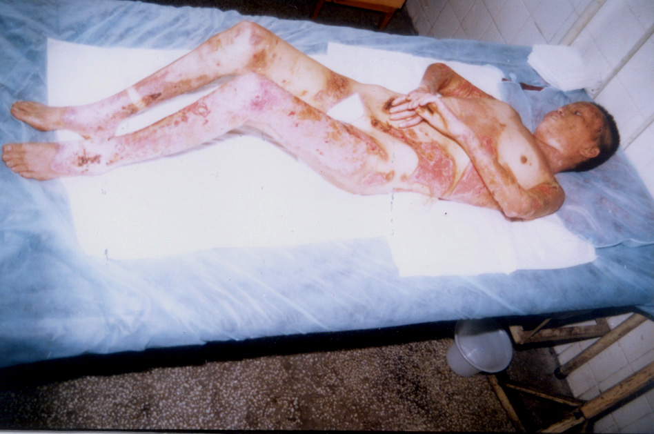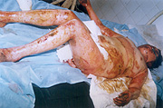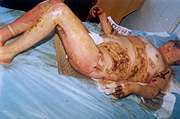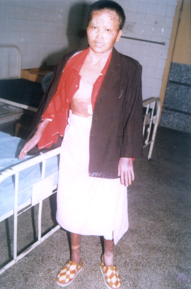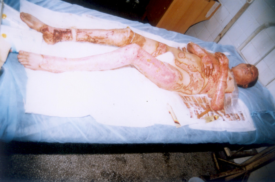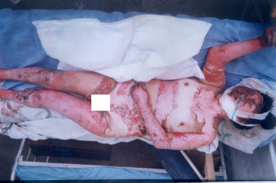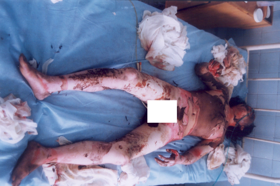 10月5日,宜春市人民醫(yī)院燒傷中心收治二例特大面積燒傷患者,煙花炮竹爆炸致全身被硝火燒傷,面積分別為92%和95%,后在燒傷中心全體醫(yī)務(wù)人員的奮力搶救下,應(yīng)用燒傷濕性醫(yī)療技術(shù),創(chuàng)面全程采用MEBT/MEBO系統(tǒng)治療,終于將病人從死亡線上挽救回來,病人已于近日痊愈出院。現(xiàn)報(bào)道如下: 病例一:患者湯某某、女性、28歲,全身硝火燒傷7小時(shí)入院,入院診斷:(1)、特重度燒傷(總面積92%,其中三度創(chuàng)面占30%,深二度創(chuàng)面占35%,淺二度創(chuàng)面占27%);(2)、重度休克;(3)、下頜骨骨折。入院后立即給予靜脈補(bǔ)液,抗休克治療,全身應(yīng)用抗生素防治感染,創(chuàng)面簡單清創(chuàng)、耕耘減張后外涂美寶濕潤燒傷膏,采取濕潤暴露療法,休克期后,行下頜骨骨折復(fù)位固定,鼻飼飲食。創(chuàng)面規(guī)范應(yīng)用濕性醫(yī)療技術(shù),全程采用MEBT/MEBO,及時(shí)清除創(chuàng)面分泌物。期間病人曾多次出現(xiàn)應(yīng)激性潰瘍大出血等并發(fā)癥,經(jīng)采取靜脈點(diǎn)滴立止血,胃管注入云南白藥等止血措施,出血癥狀得到控制。體溫控制在本38~39℃左右,血培養(yǎng)(一),創(chuàng)面修復(fù)進(jìn)展順利。淺二度創(chuàng)面七天愈合,深二度創(chuàng)面25天左右愈合,三度創(chuàng)面32天左右愈合,住院46天痊愈出院。出院時(shí)病人能在家屬攙扶下從3樓病房走到一樓。(詳見資料照片)