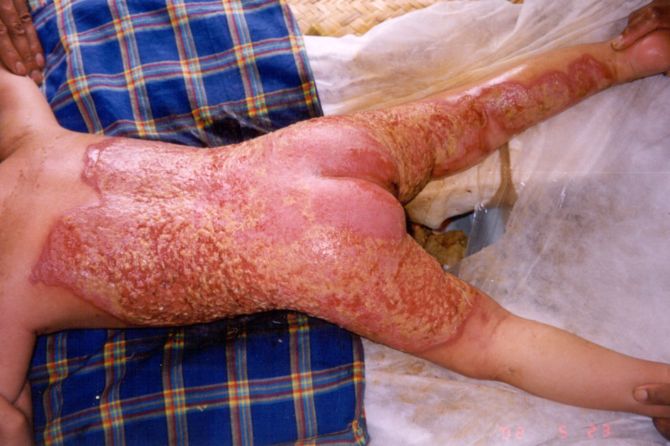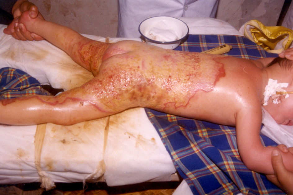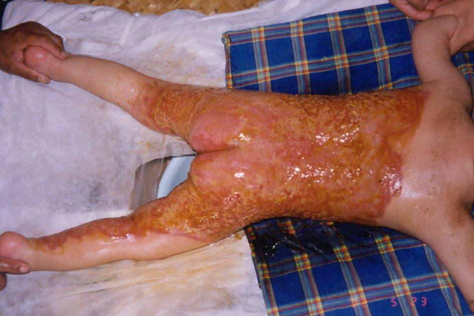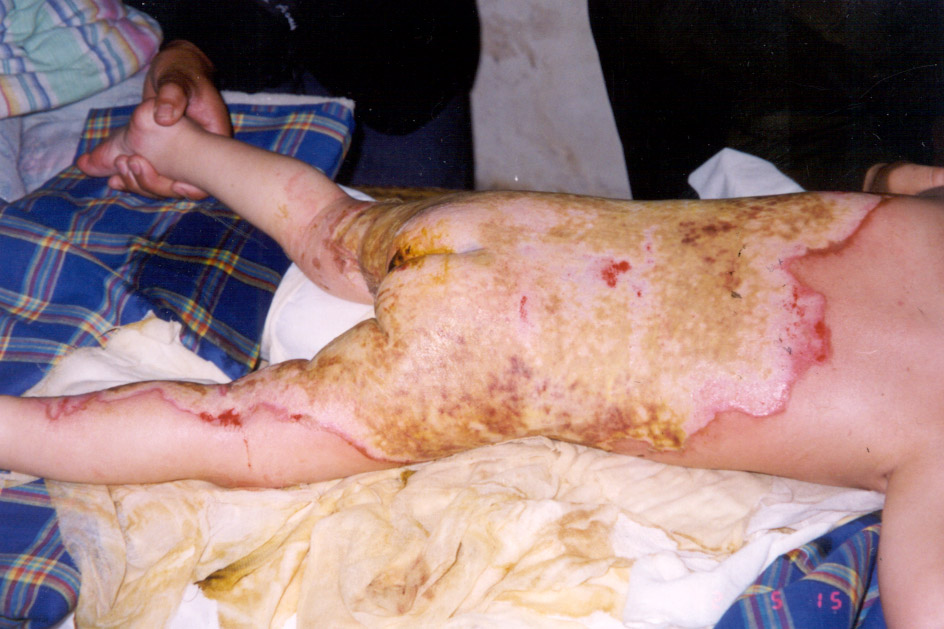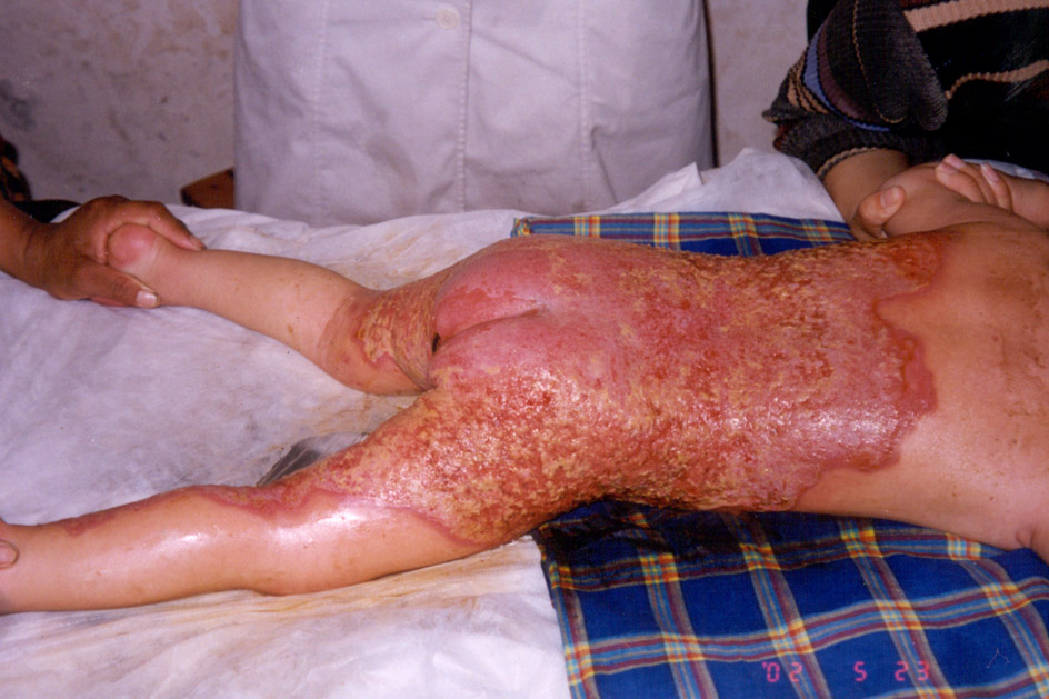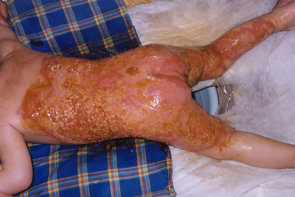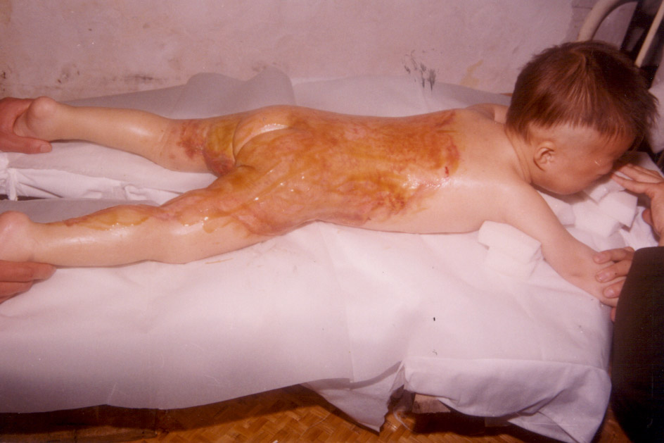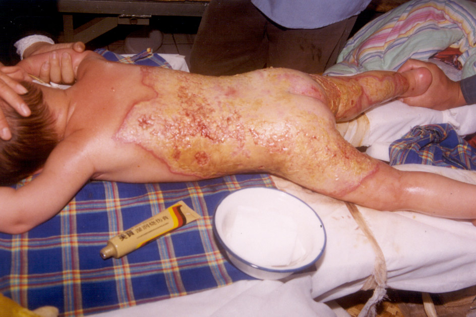 2002年05月09日,安徽省渦陽(yáng)三星化工醫(yī)院燒傷科收治一例沸水燙傷小兒,該患兒,男性,一歲零三個(gè)月,入院診斷:全身沸水燙傷總面積30%TBSA(深Ⅱ度18%,Ⅲ度12%)并低血容量性休克;患兒入院后,在對(duì)其實(shí)施積極有效的復(fù)蘇抗休克的同時(shí),創(chuàng)面處理采用皮膚再生技術(shù)暨燒傷濕性醫(yī)療技術(shù),外涂美寶濕潤(rùn)燒傷膏治療;此間,先后在山東泰山醫(yī)學(xué)院附屬醫(yī)院燒傷科主任王廣順、中國(guó)燒傷創(chuàng)瘍科技中心臨床部主任王洪生的全程臨床指導(dǎo)下,使患兒先后度過(guò)休克、感染、內(nèi)臟并發(fā)癥(反復(fù)消化道出血)等難關(guān),目前已近傷后二十天,患兒生命體征穩(wěn)定,創(chuàng)面壞死組織完全液化壞死脫落,Ⅲ度創(chuàng)面肉芽組織屏障已形成,創(chuàng)面正在愈合中。