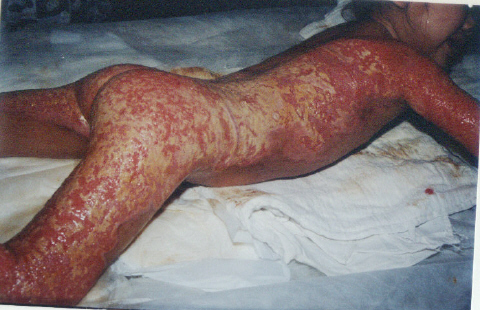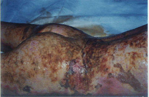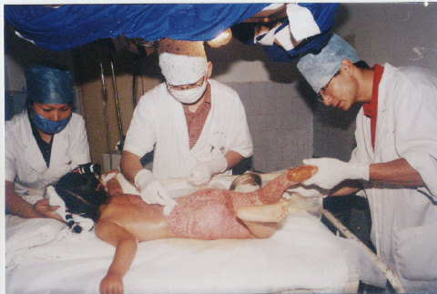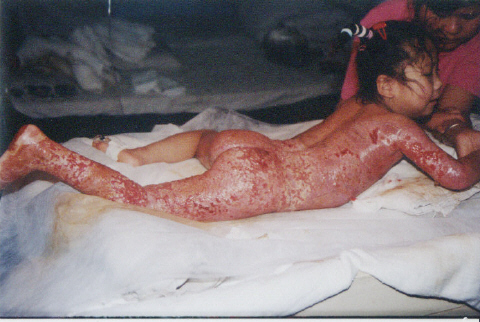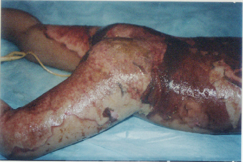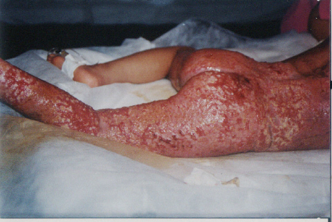 | 2002年4月28日,中國燒傷創(chuàng)瘍柳鋼科技醫(yī)療中心收治了一名來自柳州市郊區(qū)某鄉(xiāng)的三歲半的小兒黃某某。該患兒因不慎跌入沸水鍋中,而使腰背部、臀部、會(huì)陰部、腹部、右上肢及雙下肢燙傷。臨床診斷:特重度燒傷總面積42%TBSA(II度17%、淺III度25%)。傷后約兩個(gè)小時(shí)送到柳鋼燒傷治療中心,該中心的醫(yī)護(hù)人員即采用燒傷濕性醫(yī)療技術(shù)對(duì)患兒展開了救治,創(chuàng)面全程采用燒傷濕潤暴露療法進(jìn)行處理,使患兒平穩(wěn)度過了休克期、感染期,創(chuàng)面修復(fù)過程無感染發(fā)生,治療35天創(chuàng)面愈合,無功能障礙及明顯的瘢痕增生,達(dá)到了非常理想的治療效果。