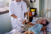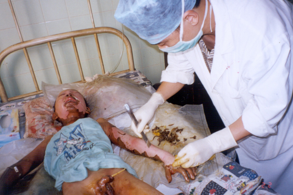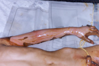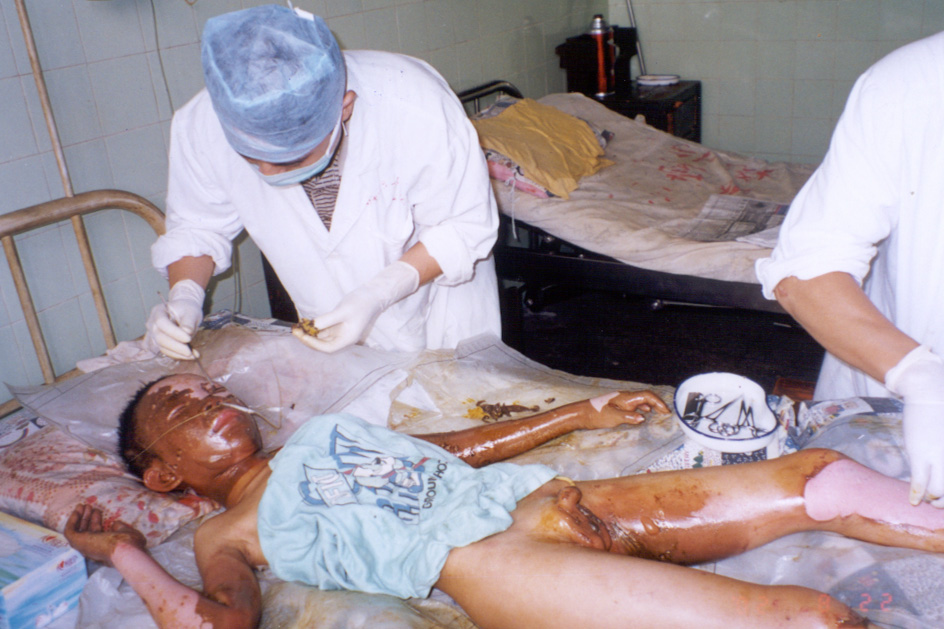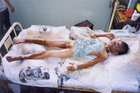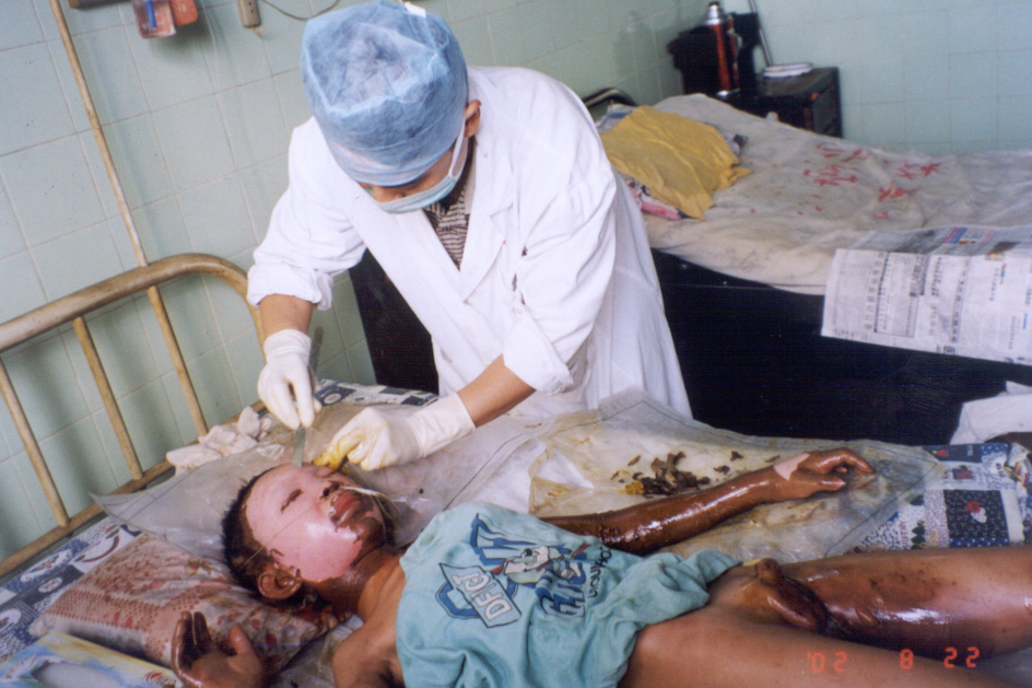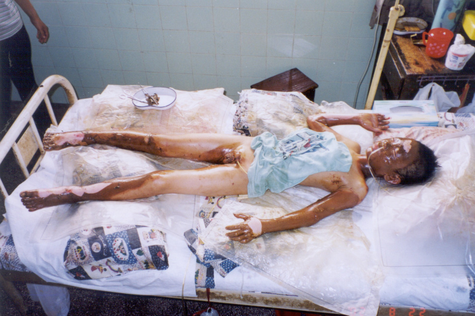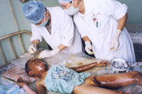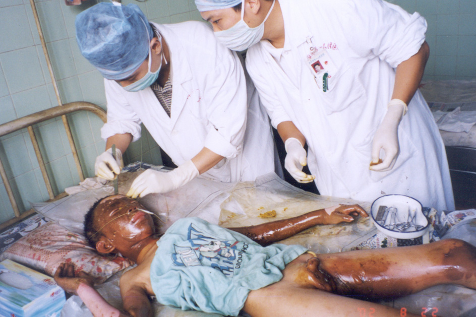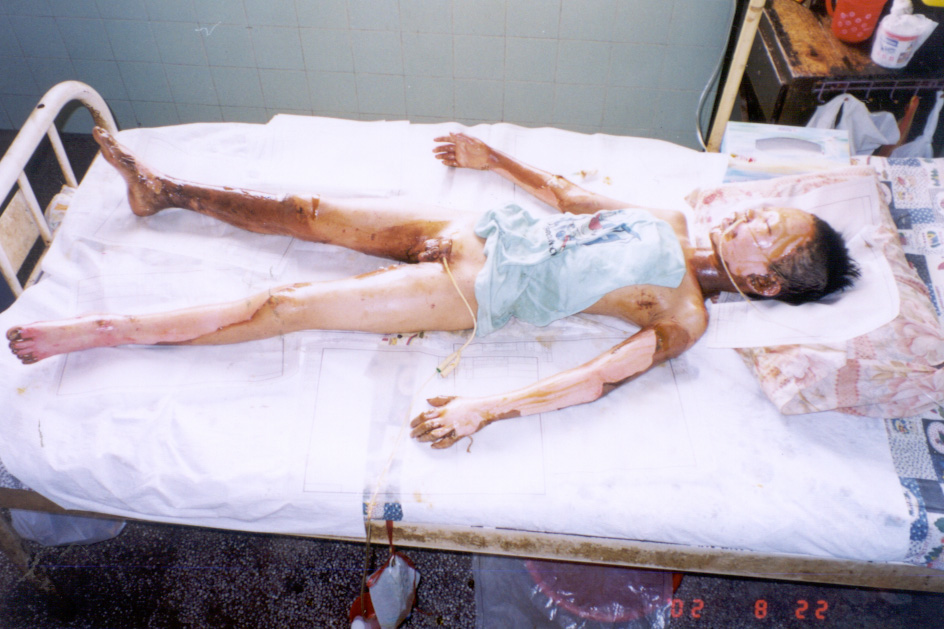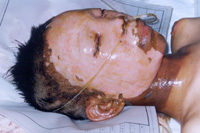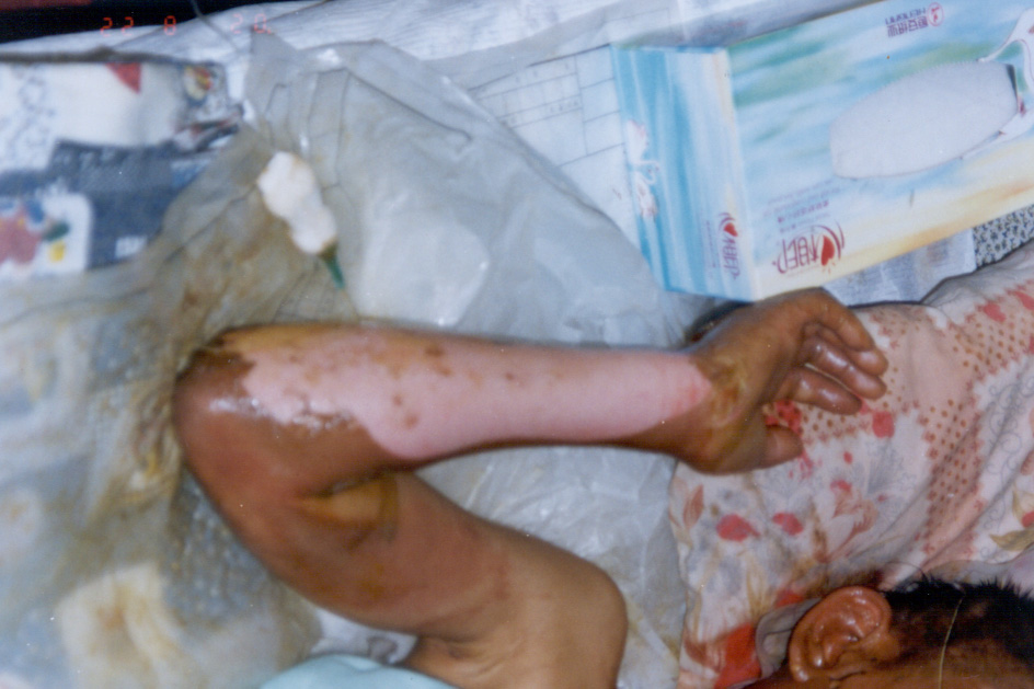 2002年8月20日上午11時(shí),廣東省開(kāi)平市第一人民醫(yī)院燒傷科收治一例因火藥爆炸導(dǎo)致嚴(yán)重?zé)齻幕純。該患兒,男性?1歲,入院前2小時(shí)因不慎引爆自制火藥彈燒傷全身多處,查體見(jiàn),神清,急性痛苦病容,頭、面、頸、四肢、會(huì)陰部燒傷創(chuàng)面無(wú)水皰、無(wú)滲出、無(wú)疼痛,表皮呈灰褐色,部分表皮脫失,基地蒼白,鼻毛燒焦,咽部充血。入院診斷:1、全身燒傷總面積45%TBSA(深二度15%、淺三度30%);2、輕度吸入性損傷;3、低血容量性休克。入院后,創(chuàng)面立即采用MEBT/MEBO治療,為確保患兒的成功救治,該院特邀中國(guó)燒傷創(chuàng)瘍科技中心臨床總部主任王洪生前來(lái)會(huì)診,經(jīng)王主任親臨該院指導(dǎo)搶救,目前,該患兒已平穩(wěn)渡過(guò)了休克期。 |