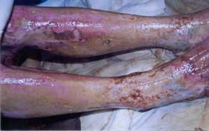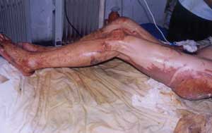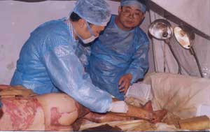 2002年9月30日,福建省福安市醫(yī)院收治了一例大面積燒傷患者。病人劉某某,男性,46歲,福安市賽岐鎮(zhèn)蘇洋村人,因磚窯倒塌致全身多處被熱磚燒傷一個(gè)半小時(shí)入院。診斷為特重度燒傷(總面積65%,其中淺Ⅱ度10%,深Ⅱ度30%,Ⅲ度25%)。入院后,創(chuàng)面外用濕潤(rùn)燒傷膏(MEBO),及抗休克補(bǔ)液等處理。傷后第三天起,病人出現(xiàn)高熱(體溫39-40攝氏度),煩躁、譫妄等。針對(duì)病人情況,福安市醫(yī)院立即向中國燒傷創(chuàng)瘍科技中心總部聯(lián)系,請(qǐng)求派專家會(huì)診。傷情就是命令,中心總部立即派中國燒傷創(chuàng)瘍科技中心專家會(huì)診團(tuán)專家姚世紅主任前往福安市醫(yī)院,姚世紅主任日夜兼程,于10月3日凌晨4時(shí)到達(dá)福安市醫(yī)院,顧不得旅途疲勞,立即深入病房查看病情,當(dāng)時(shí)病人已極度狂燥,胡言亂語,高燒不退,口唇青紫,尿液呈深紅色,心率120-140次/分,病人家屬已作好料理后事的準(zhǔn)備。針對(duì)病人癥狀及創(chuàng)面情況,姚主任采取了一系列搶救措施,如靜滴冬眠合劑鎮(zhèn)靜,應(yīng)用強(qiáng)力有效抗生素加強(qiáng)抗炎,及強(qiáng)心、護(hù)腎等。并對(duì)創(chuàng)面重新清創(chuàng),規(guī)范使用MEBT/MEBO。經(jīng)過18小時(shí)緊張搶救,至10月3日晚上10時(shí),病人終于轉(zhuǎn)危為安,人安靜了,神志清醒了,體溫降了下來,生命體征也平穩(wěn)了。10月4日起,病人已開始能進(jìn)流質(zhì)飲食了。 10月6日,當(dāng)會(huì)診專家離開時(shí),病人食欲尚可,二便正常,體溫維持在37.5-38.5度,神志清楚,心肺檢查無異常,深度創(chuàng)面已開始正常液化,淺Ⅱ度創(chuàng)面已部分愈合了。福安市醫(yī)院領(lǐng)導(dǎo)及外科醫(yī)務(wù)人員對(duì)中心總部能及時(shí)派來專家會(huì)診表示非常感謝。燒傷病房陳方凱主治醫(yī)師更是激動(dòng)萬分,表示以后一定要在中心總部指導(dǎo)下,把燒傷濕性醫(yī)療技術(shù)更好地造福于廣大燒傷患者。病人家屬緊緊握住即將離開地會(huì)診專家的手,一再表示謝意。感謝中國燒傷創(chuàng)瘍科技中心專家領(lǐng)導(dǎo),祝天下所有不幸的燒傷患者,能在燒傷濕性醫(yī)療技術(shù)治療下成為幸運(yùn)者。