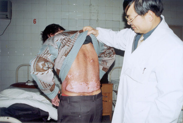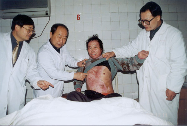 一到宜春,肖摩教授不顧旅途勞累,就立即到宜春市人民醫(yī)院燒傷中心查看病人;颊哧惸,2002年4月1日因煙花爆炸燒傷,在宜春市人民醫(yī)院全程接受燒傷濕性醫(yī)療技術(shù)救治后治愈出院,總面積95%,Ⅲ度40%,深Ⅱ度50%,淺Ⅱ度5%,住院40天后出院。肖摩教授查看了病人的愈合創(chuàng)面,見(jiàn)雙手Ⅲ度愈合創(chuàng)面僅有輕微疤痕,質(zhì)地軟,不影響功能,大腿Ⅲ度愈合創(chuàng)面稍有隆起,質(zhì)地薄軟,無(wú)功能障礙,其余深Ⅱ度愈合無(wú)疤痕,平整,病人活動(dòng)正常,無(wú)功能障礙。肖摩教授仔細(xì)詢問(wèn)了病人的恢復(fù)情況,認(rèn)為該病例是燒傷濕性醫(yī)療技術(shù)的成功應(yīng)用范例,請(qǐng)病人參加第二天舉行的專家鑒定會(huì),請(qǐng)到會(huì)專家查看,以進(jìn)一步增加對(duì)燒傷濕性醫(yī)療技術(shù)的了解。 12月12日上午,宜春市科技局在宜春市人民醫(yī)院組織召開了由宜春市人民醫(yī)院姚世紅副主任醫(yī)師主持的“應(yīng)用燒傷濕性醫(yī)療技術(shù)治療特大面積燒傷的臨床研究”成果鑒定會(huì)。與會(huì)專家認(rèn)真聽取了課題組工作報(bào)告和技術(shù)報(bào)告,審查了有關(guān)資料,并請(qǐng)來(lái)了燒傷康復(fù)患者陳某,專家們仔細(xì)察看了患者全身愈合創(chuàng)面,關(guān)節(jié)活動(dòng)情況,并讓病人做著各種動(dòng)作,甚至用了“奇跡”這個(gè)形容詞來(lái)表達(dá)對(duì)燒傷濕性醫(yī)療技術(shù)的認(rèn)可。