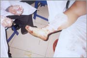 患者到達(dá)燒傷科后,全體醫(yī)護(hù)人員在胡教授的指揮下,按傷情的不同迅速將傷員安置到各病房,進(jìn)行有條不紊的檢查傷情、輸液清創(chuàng)。因該批患者在廢水中停留時(shí)間較長(zhǎng),故創(chuàng)面大部分為淺三度和深三度,最大面積37%,最小面積16%。為盡快恢復(fù)局部的血液循環(huán),解除三度創(chuàng)面的環(huán)形壓迫,我們分別對(duì)不同的淺、深三度創(chuàng)面用耕耘刀和手術(shù)刀及滾軸刀進(jìn)行處置松解,用濕潤(rùn)燒傷膏涂抹創(chuàng)面,全部患者均采用徐榮祥教授發(fā)明的濕性醫(yī)療技術(shù)救治。