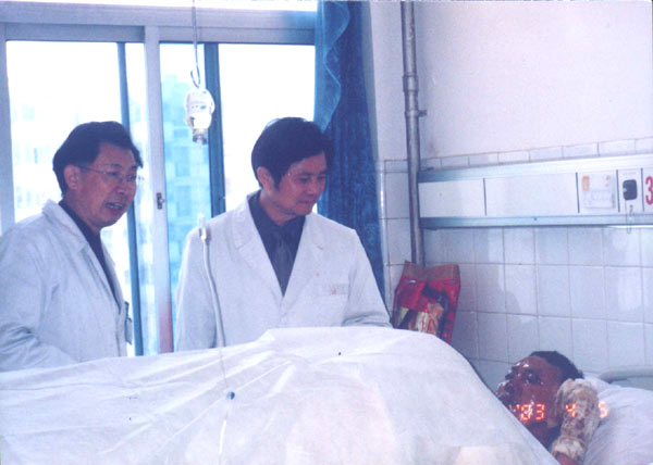 “120”在轉(zhuǎn)送患者的同時通知醫(yī)院做好接收傷員的準(zhǔn)備。醫(yī)院聞訊后,該院周偉院長立即組織以燒傷創(chuàng)瘍科主任陸炳康主任醫(yī)師為首的搶救小組,迅速在全院組織調(diào)配醫(yī)護人員調(diào)整病房,準(zhǔn)備藥品,做好一切迎接傷員的準(zhǔn)備工作。 隨著陣陣“120”急救車的鳴笛聲,8名燒傷患者被抬入燒傷創(chuàng)瘍科。在周院長和陸主任的正確指揮下,醫(yī)護人員有條不紊地將患者安置到每個已準(zhǔn)備就緒的病房,之后迅速采取補液等綜合處置措施。創(chuàng)面行簡單清創(chuàng)后全部用濕潤燒傷膏分別行暴露或包扎療法。