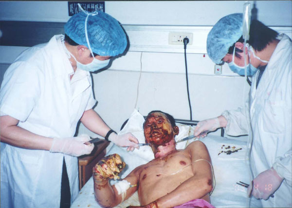 2003年4月1日上午,江蘇省連云港市某火鍋酒家的服務(wù)員因工作時不慎,突然發(fā)生煤氣罐爆炸起火,瞬間,室內(nèi)火光沖天,煙霧彌漫,致使8名員工在逃生時燒傷頭面部、頸部及背部和四肢,當(dāng)時,每位患者均呻吟不止,痛苦不堪,即被“120”急救車迅速送至連云港中醫(yī)院燒傷創(chuàng)瘍科搶救。