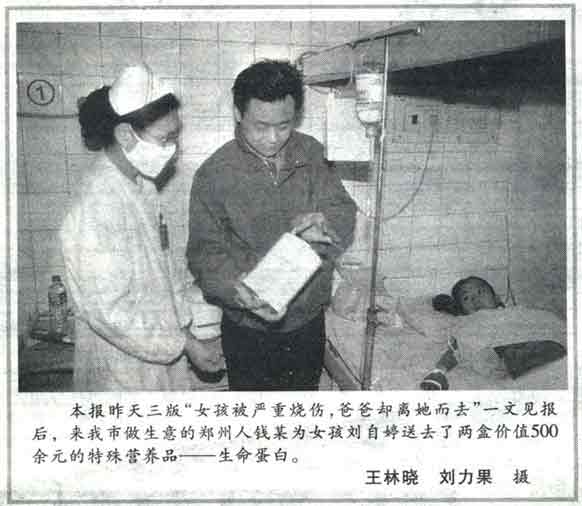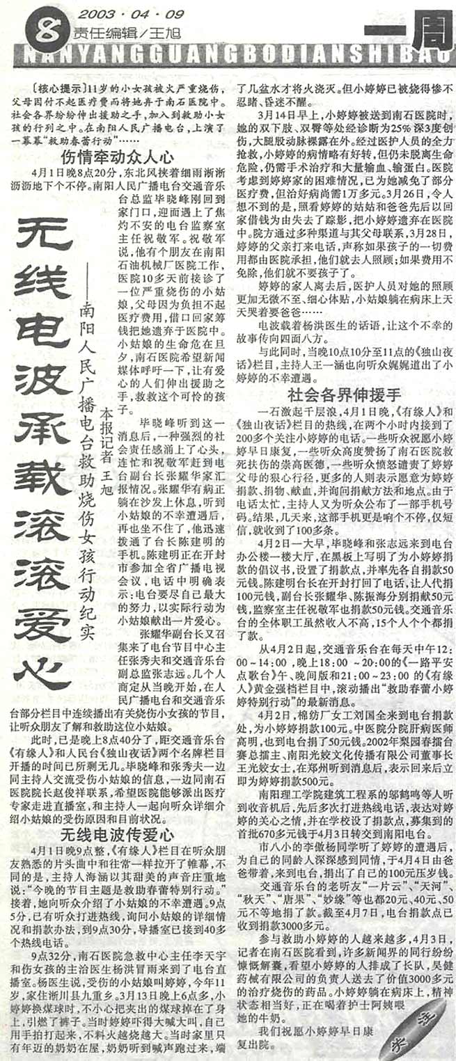 一個叫劉自婷的12歲女孩是不幸的,而她又是特別幸運的。 家住河南省淅川縣九重鄉(xiāng)的小自婷,2003年3月14日被大火嚴重燒傷。后經南陽燒傷中心(南石醫(yī)院)全力救治,在后因醫(yī)療費被親人遺棄到醫(yī)院,再后來被醫(yī)院的白衣天使、當?shù)氐男侣劽襟w以及更多更多人的親情所包圍、所呵護: 南陽廣播電臺: 交通音樂臺開辟黃金欄目《有緣人》 人民臺《獨山夜話》連續(xù)播出——“救助春蕾行動” 社會捐款及媒體報道: