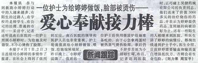 女孩近況: 《南陽日報》特辟專欄予以報道;《南陽晚報》實施了連續(xù)報道,特別關注;《南陽廣播電視報》也予大篇幅報道。 連續(xù)半個月來,來探視小自婷的愛心人絡繹不絕,捐款捐物獻血者不計其數(shù)...... 但小自婷的傷勢終究是嚴重的;全身25%三度燒傷,救助小自婷還需要更多人給予關愛。 南石醫(yī)院在盡力減免醫(yī)療費,給予百般呵護的基礎上,實施了連續(xù)手術治療。 為了小自婷花朵般的生命。 為了小自婷美好的未來。 仍然需要我們大家伸出關愛、希望之手,繼續(xù)關注小自婷......