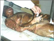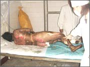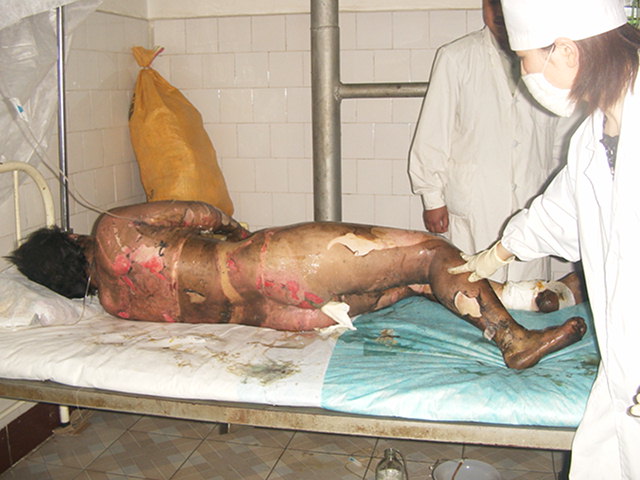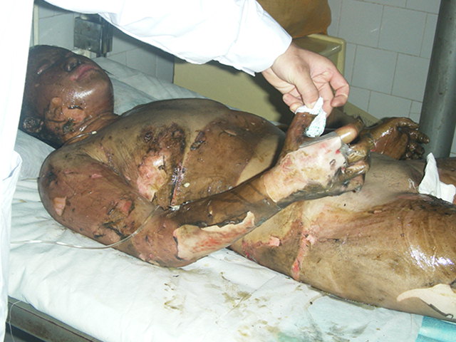 2003年6月3日下午1時(shí)30分,河南省周口市長(zhǎng)城燒傷醫(yī)院燒傷病區(qū)轉(zhuǎn)入一例因火藥爆燃導(dǎo)致的大面積燒傷患者,該患者,女,32歲,河南省太康縣人。以“全身多處被火藥火焰燒傷24小時(shí)”為主訴急診入院。入院時(shí)查體:體溫:37.4℃,脈搏:130次/分,呼吸:28次/分,血壓:0/0mmHg,神志清楚,精神萎靡,少尿,雙眼瞼腫脹不能啟視,鼻毛燒焦,咽部充血,聲音嘶啞,燒傷創(chuàng)面分布于全身絕大部分,前軀干、雙手、雙前臂、及雙下肢創(chuàng)面無(wú)水皰、無(wú)滲出、無(wú)疼痛、創(chuàng)面表皮部分脫落,創(chuàng)面基底呈蒼白色,其余創(chuàng)面基底均呈紅白相間,滲出較少,痛覺(jué)遲鈍,污染重。入院診斷:1、全身火藥火焰燒傷總面積90%TBSA(深二度50%、三度40%)、特重度;2、低血容量性休克;3、中度吸入性損傷。入院后在積極抗休克、抗感染、支持、對(duì)癥處理的同時(shí),全身創(chuàng)面應(yīng)用MEBT/MEBO。
