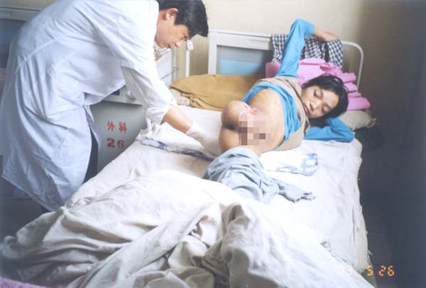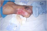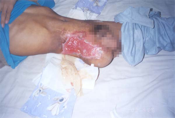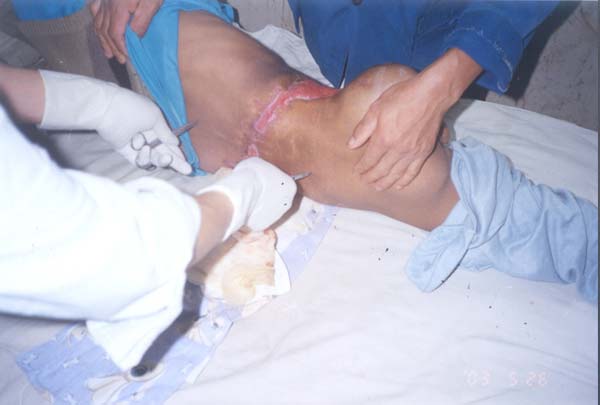 2003年3月28日,災(zāi)難無情地落在霍邱縣馬店鎮(zhèn)盧山村新建隊的24歲農(nóng)民李榮堂的身上,因工作時不慎被拽入攪拌機,傷后緊急被霍邱縣第二人民醫(yī)院救護車接至醫(yī)院;颊呷朐簳r精神萎靡,表情淡漠,查體欠合作,面色蒼白,口唇青紫,右下腹破裂可見小腸外溢,右大腿骨盆血肉模糊,出血不止,右下腹近髂脊處可見一長約15cm裂口,深達(dá)肌筋膜淺層,右股骨外露,股骨四周肌肉、血管、神經(jīng)斷離,右側(cè)髂骨粉碎骨折,均無活動性出血,后背皮膚呈完全橫斷型裂傷,傷口不規(guī)則,可見許多機油類似物沾涂于表面,右臀部皮膚呈條狀,為2×10cm,約4條,右側(cè)陰囊撕裂,睪丸外露;颊呷朐撼醪皆\斷為:失血性休克;開放性腹部損傷;下腹皮膚挫裂傷多處;右下肢缺血待查;右側(cè)陰囊外傷。入院后隨即給予補液、抗休克、抗感染、右下肢截肢等治療。由于病人皮膚挫裂傷多處、面積大,且患者病情垂危,營養(yǎng)狀況差,傷口修復(fù)慢,植皮又不成活,傷口如何修復(fù)?一道難題擺在醫(yī)護人員面前,一個24歲年輕的生命牽動著人們的心。
