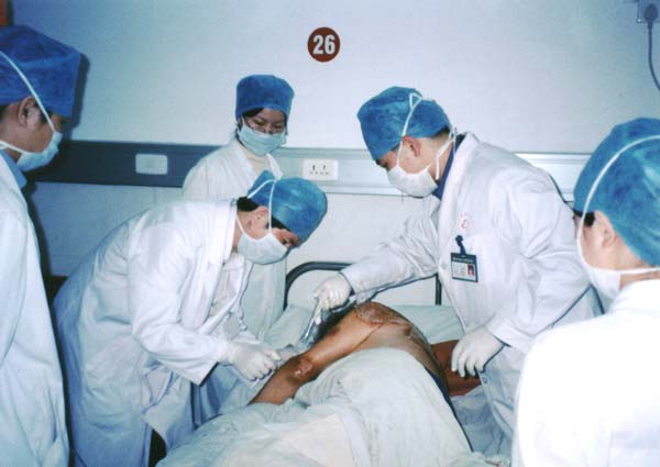 在與陳院長(zhǎng)交流后,胡主任應(yīng)邀到病房進(jìn)行臨床交流,指導(dǎo)醫(yī)護(hù)人員正確使用疤痕平治療增生性疤痕及示教規(guī)范處理創(chuàng)面。醫(yī)護(hù)同仁表示獲益匪淺。并表示盡快規(guī)范掌握技術(shù),用這一先進(jìn)技術(shù)去更好地救治大面積燒傷患者。真正在江西起到推廣善及的龍頭作用。