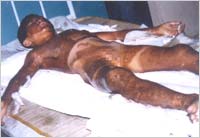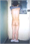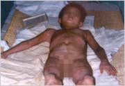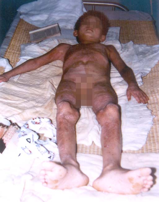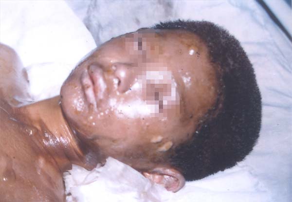 瞿繼忠,男,11歲,2001年6月29日在玩耍時不慎被油漆稀料和汽油混合氣體引發(fā)的爆炸燒傷全身,當(dāng)時醫(yī)院診斷是85%面積深度燒傷(孩子的大伯對我們說當(dāng)時孩子只有短褲的部位沒有被燒,其余全身沒有一處好皮膚),其中以深二度燒傷創(chuàng)面為主,下腹部和雙下肢有散在的淺三度創(chuàng)面;純喝朐汉蠼o予全身清創(chuàng)后外涂美寶濕潤燒傷膏,全程應(yīng)用燒傷濕潤暴露療法,燒傷前兩周配合靜脈給予氨基酸和脂肪乳等營養(yǎng)支持,復(fù)達(dá)欣抗感染治療,每次1支,每日兩次。治療過程中患兒曾出現(xiàn)十余天的持續(xù)高熱,體溫在39~40.9℃之間,但在高熱期,患兒的食欲、精神一直很好。經(jīng)過一個半月的精心治療,患兒全身創(chuàng)面愈合,于2001年8月17日出院。