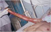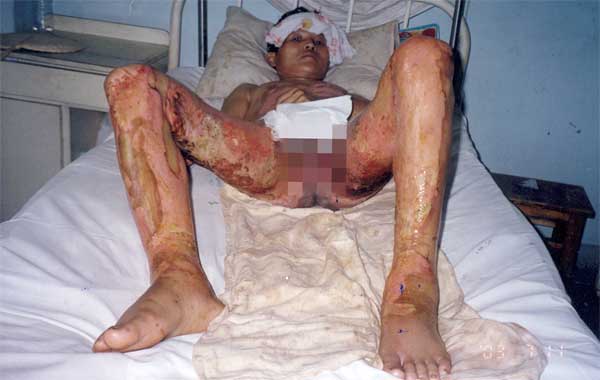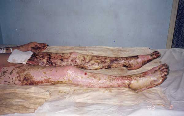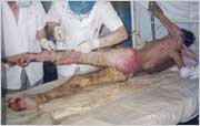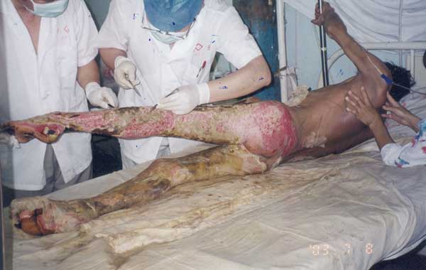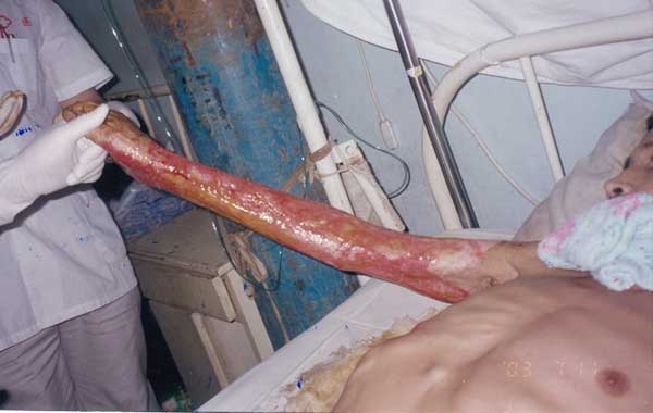 2003年6月20日,是宣城活炭廠工人黃家定不幸的一天,他在工作時不慎跌入含有30%磷酸沸水池內(nèi),致全身燒燙傷,總面積達54%,(淺三度10%,深三度44%。其深三度組織損傷程度深達皮下及深筋膜層)。由于患者屬于強酸化學燒傷,沸水燙傷,合并磷中毒損傷,入院后4天,患者即出現(xiàn)了敗血癥,應(yīng)激性潰瘍大出血、肺水腫、嚴重低蛋白血癥、代謝性酸中毒、全身浮腫、全骨髓抑制、心肌損害等多種并發(fā)癥。