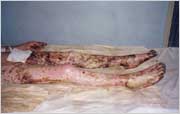 陳某某,男,45歲,全身大面積沸水燙傷,總面積58%又訊:該院于2003年7月5日又收治了一例沸水燒傷雙下肢,臀部,會陰部及軀干部,總面積58%(深二度30%,潛三度18%,深三度10%),全程采用皮膚再生醫(yī)療技術(shù)救治。目前,患者生命體征平穩(wěn),未發(fā)生任何并發(fā)癥。此技術(shù)的先進性再次在患者身上得到了肯定。