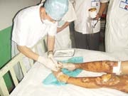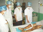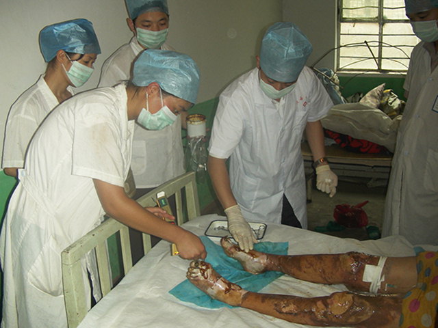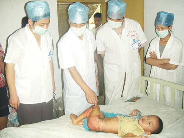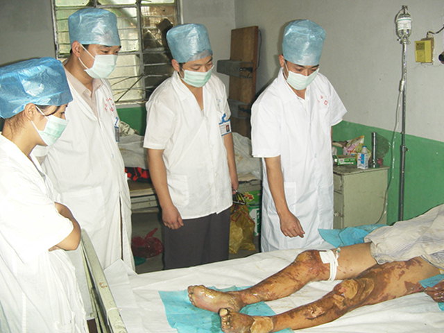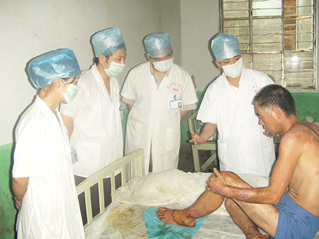 2003年8月22日,中國燒傷創(chuàng)瘍科技中心臨床總部主任王洪生應(yīng)邀來到地處豫北地區(qū)的河南省滑縣第三人民醫(yī)院會診和臨床學術(shù)交流。王主任到達該院后,在該院副院長張文豪和燒傷科主任賈參政及燒傷科醫(yī)護人員陪同下,首先深入燒傷病房為一例74歲的老年重度燒傷合并消化道出血的患者進行了全面體檢,并向陪同的醫(yī)護人員現(xiàn)場示范了對該患者雙足背三度燒傷創(chuàng)面進行"藥刀結(jié)合"處理的方法及技術(shù)要領(lǐng),還就預(yù)防褥瘡的護理要點向在場的醫(yī)護人員進行了重點講述;然后在賈參政主任的引導下,王主任又進入其它燒傷病房對所有住院燒傷患者一一進行了查看,并就這些患者下一步的治療,向現(xiàn)場的醫(yī)護人員進行了詳細講述和臨床指導。查房結(jié)束后,王主任在醫(yī)生辦公室就這例老年重度燒傷合并消化道出血患者下一步的治療提出了詳細的治療計劃。隨后,王主任又在該醫(yī)院院長辦公室與專程趕到的該縣衛(wèi)生局主管業(yè)務(wù)的副局長、該院院領(lǐng)導班子成員及燒傷科主任就該院下一步燒傷重點專科建設(shè)、技術(shù)支持等問題進行了廣泛而深入的交流。 中國燒傷創(chuàng)瘍科技中心臨床部