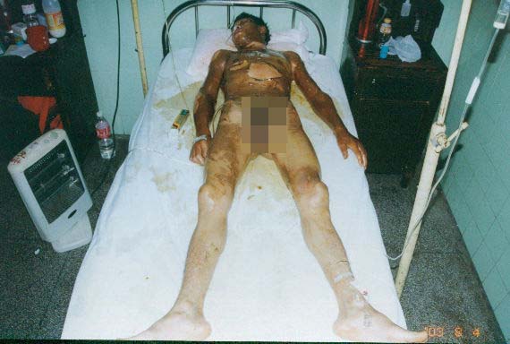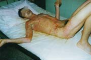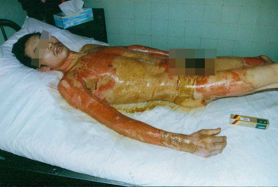 2003年7月24日及8月4日以來,廣東省開平市第一人民醫(yī)院燒傷科采用燒傷皮膚再生醫(yī)療技術(shù)分別治愈一例小兒和一例成人大面積燒傷: 病例一、患兒男,4歲,因"全身多處沸水燙傷伴疼痛16小時"為主訴于2003年7月24日入院;入院時查體,T:38.5℃,P:96次/分,R:24次/分,軀干、會陰、臀部及雙大腿見大片燙傷創(chuàng)面,絕大部分創(chuàng)面表皮脫落,腹部小部分創(chuàng)面潮紅,感覺過敏,其余大部分創(chuàng)面紅白相間,少量滲出,入院診斷:全身多處沸水燙傷45%TBSA(淺二度5%、深二度40%);特重度。