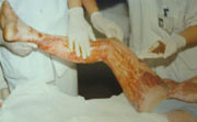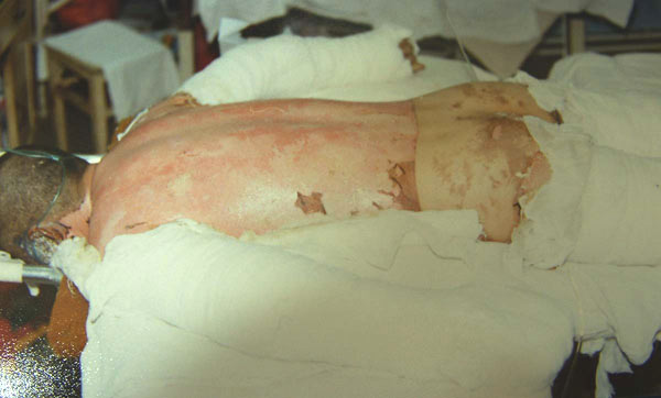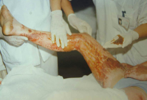 患者,顧某某,男,41歲,2003年8月3日,因煤氣失火燒傷全身1小時(shí)由120救護(hù)車(chē)轉(zhuǎn)入我院急診,已出現(xiàn)休克、水電解質(zhì)紊亂、低蛋白血癥等,生命垂危,尿量少于20毫升/小時(shí),口渴明顯,肢端冰冷、精神萎靡,燒傷總面積達(dá)90%淺二度達(dá)28%、深二度達(dá)41%、淺三度達(dá)21%,伴呼吸道燒傷,體溫38.5度,脈搏140次/分,白細(xì)胞計(jì)數(shù)16.2中性0.8,紅細(xì)胞、血球壓積、血小板、總蛋白、白球比均低,電解質(zhì)酸堿平衡失調(diào)、血?dú)馓崾净旌闲运嶂卸。入院診斷:火燒傷全身90%,三度21%,伴呼吸道燒傷,并發(fā)休克。由于患者病情危重,在醫(yī)院醫(yī)務(wù)處主持協(xié)調(diào)下,組建了以燒傷科趙賢忠主任、副教授為首的搶救小組,立即對(duì)病人進(jìn)行深靜脈置管建立有效的輸液通道,以糾正休克和內(nèi)環(huán)境紊亂,防治感染和各種嚴(yán)重并發(fā)癥,并進(jìn)行特護(hù)、監(jiān)測(cè)病情…… 搶救小組與中國(guó)燒傷創(chuàng)瘍科技中心臨床總部專(zhuān)家聯(lián)系,總部胡棟才主任聽(tīng)取匯報(bào)后當(dāng)即電話(huà)指示:l、積極補(bǔ)液復(fù)蘇糾正休克,2、應(yīng)用高效足量抗生素,3、全身支持治療,糾正內(nèi)環(huán)境紊亂,維護(hù)多器官功能等,4、加強(qiáng)創(chuàng)面規(guī)范化處理,采用燒傷皮膚再生醫(yī)療技術(shù)的局部療法進(jìn)行治療。5、加強(qiáng)護(hù)理。經(jīng)過(guò)一周的全力搶救,患者病情已被有效控制、轉(zhuǎn)危為安,并漸趨好轉(zhuǎn)。 傷后二周,病情穩(wěn)定,大部分二度創(chuàng)面已上皮化愈合,還有約36%的深度創(chuàng)面末愈,搶救小組的全體成員特別是趙主任,不知?jiǎng)诶,密切關(guān)注病情的變化,爭(zhēng)取在皮膚再生新技術(shù)的治療下,促使深度創(chuàng)面完全自行修復(fù)。傷后第三周,病情穩(wěn)定,未愈的創(chuàng)面僅為21%,其中有散在皮島形成,趙主任再次與胡棟才主任聯(lián)系、胡主任表示淺三度創(chuàng)面完全可以用非手術(shù)方法治愈,盡快來(lái)院指導(dǎo),目前患者病情穩(wěn)定,創(chuàng)面正在逐步再生修復(fù)中。 江蘇南通醫(yī)學(xué)院第二附屬醫(yī)院燒傷外科