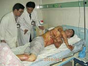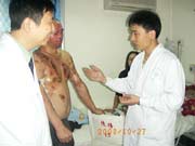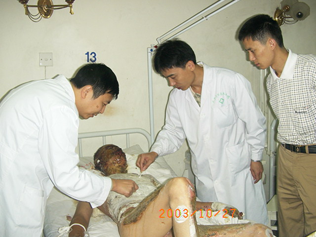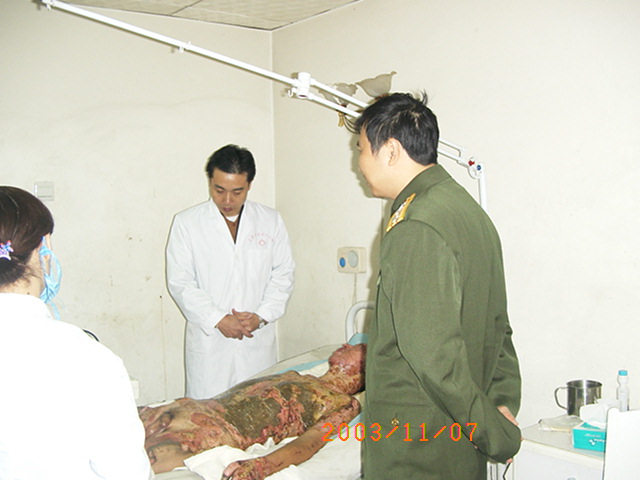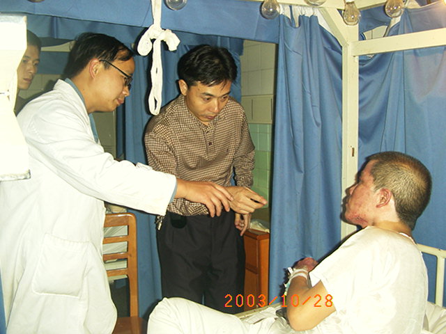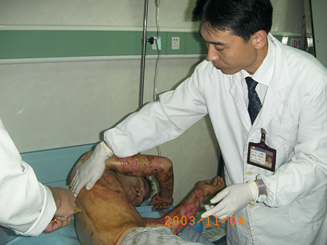 2003年11月4日,王主任又應邀先后到廣東省佛山市南海區(qū)小塘醫(yī)院和南海區(qū)人民醫(yī)院為一例重度燒傷(燒傷總面積45%TBSA)和一例大面積燒傷患者(燒傷總面積95%TBSA)進行了會診和臨床指導。 2003年11月7日,王主任再次到武警四川消防總隊醫(yī)院對一例大面積燒傷進行跟蹤臨床指導,并且,也為在該院治療的其他燒傷患者進行了會診。