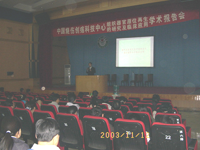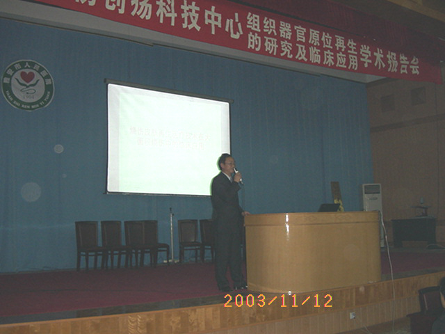 2003年11月11日下午2時,王主任在從廣州趕到成都的當天,又應邀來到四川省雅安市,參加由雅安市衛(wèi)生局和雅安市醫(yī)學會及雅安市人民醫(yī)院聯合舉辦的再生醫(yī)學研究進展和臨床應用學術報告會,當日下午2時30分,來自雅安市、區(qū)、縣各醫(yī)療衛(wèi)生單位和雅安市人民醫(yī)院的醫(yī)護人員約200余人來到雅安市人民醫(yī)院學術會議廳聆聽王洪生主任作學術報告,報告會由該院醫(yī)教科長鄭繼貴主持,王主任以“燒傷皮膚再生醫(yī)療技術在大面積燒傷中的臨床應用”為題進行了專題報告會,雅安市電視臺新聞中心記者還到會進行了現場錄像和在雅安電視新聞中進行了報導。會后,王主任還與該院醫(yī)教科科長、燒傷整形科主任就下一步燒傷皮膚再生醫(yī)療技術在該院和雅安地區(qū)的推廣、普及進行了廣泛而深入的交流。