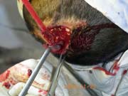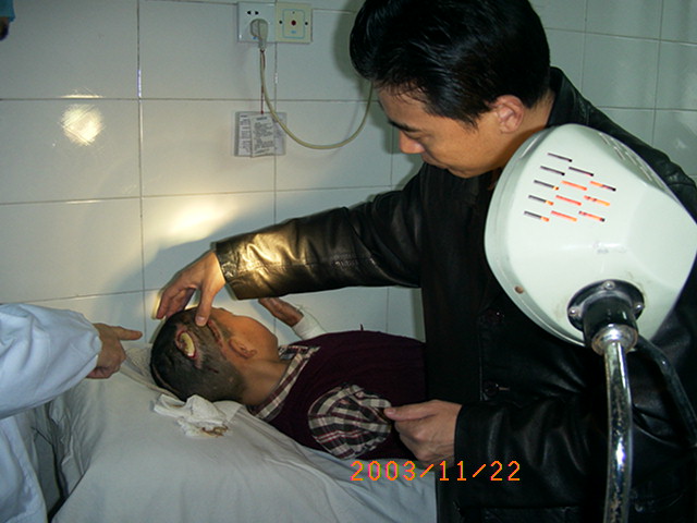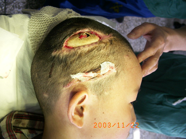 2003年11月22日上午,王主任又應(yīng)邀來(lái)到四川省內(nèi)江市第二人民醫(yī)院燒傷整形科,為在廣東省中山市某醫(yī)院治療2個(gè)多月轉(zhuǎn)入該院的一例小兒高壓電擊傷合并顱骨開放性損傷、壞死和硬腦膜外露病程已70余天患兒會(huì)診,并給該患兒實(shí)施了壞死顱骨清創(chuàng)術(shù)及用再生醫(yī)療技術(shù)為清創(chuàng)后顱骨創(chuàng)面培植肉芽創(chuàng)面。