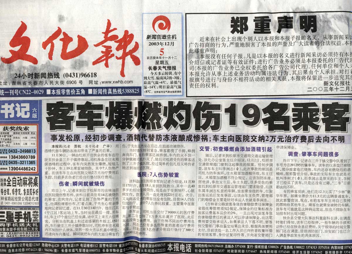 2003年11月30日下午15時左右,一輛由吉林松原市開往扶余的客車上坐滿了乘客,可是誰也沒有想到途中客車內(nèi)突然發(fā)生爆燃,短短幾十秒鐘,車上19名乘客均被燒傷,其中7人傷勢嚴(yán)重。事故發(fā)生后,傷者先被送到附近的鎮(zhèn)醫(yī)院經(jīng)過簡單的包扎后再被轉(zhuǎn)送到松原油田總醫(yī)院燒傷科(中國燒傷創(chuàng)瘍科技中心松原油田醫(yī)院分中心),作進(jìn)一步的搶救治療。