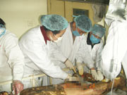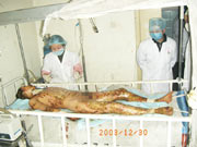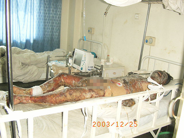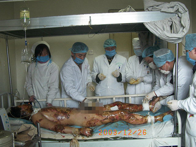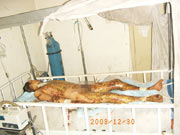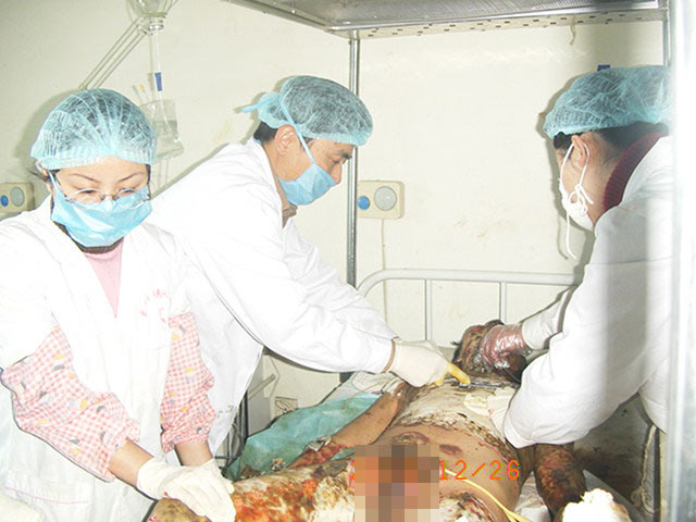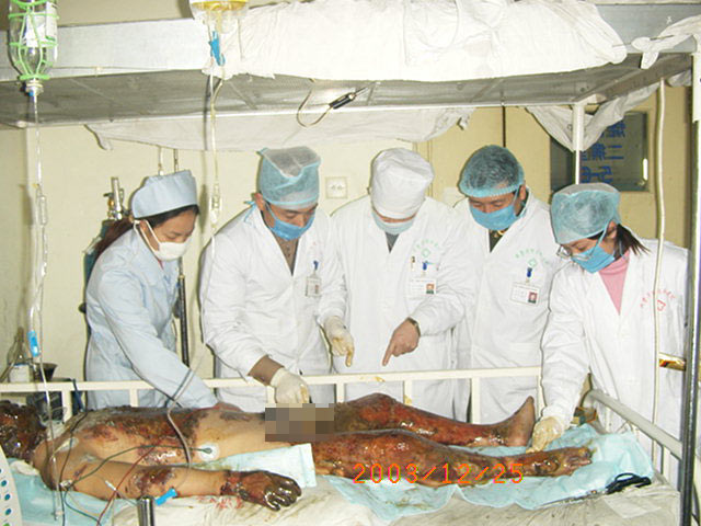 患者入院時(shí)查體:T:37.5℃,P:120次/分,R:38次/分,煩躁、譫語,全身明顯水腫,胸部創(chuàng)基呈蒼白色,可見樹枝狀血栓形成的靜脈網(wǎng),雙手皮膚呈皮革樣,雙下肢創(chuàng)面呈紅褐色皮革樣改變,也可見樹枝狀血栓形成的靜脈網(wǎng)。實(shí)驗(yàn)室檢查提示:血常規(guī):WBC22.0×109/L,RBC2.90×1012/L, HGB89/L, PLT290×9/L;肝功能:總蛋白45.35/L,白蛋白24.0/L。入院診斷:1、全身火焰燒傷總面積66%TBSA (深二度16%、三度50%);2、中度吸入性損傷;該患者入院后該院燒傷整形科主任魏平帶領(lǐng)全科醫(yī)護(hù)人員,對該患者實(shí)施了及時(shí)有效的治療,并且院領(lǐng)導(dǎo)親自出馬,為該患者治療籌措資金;為確保該患者的成功救治,減少殘疾和經(jīng)濟(jì)等方面的原因,加上2003年10月以來,該院燒傷科先后采用燒傷濕性醫(yī)療技術(shù)成功救治一例成人大面積深度燒傷患者和多例早期應(yīng)用干燥療法進(jìn)入溶痂期改用燒傷皮膚再生醫(yī)療技術(shù)的病例所取得的滿意的臨床效果,該院燒傷科主任魏平?jīng)Q定對這例患者的創(chuàng)面處理也采用燒傷皮膚再生醫(yī)療技術(shù),并邀請中國燒傷創(chuàng)瘍科技中心臨床總部主任王洪生到該院指導(dǎo)對該患者的救治工作,王主任接到會診邀請后,于2003年12月25日下午2時(shí)30分趕到該院為這例大面積深度燒傷患者會診,并親自給該患者進(jìn)行創(chuàng)面處理和換藥,并查看了正在該院接受住院治療的其他病人; 2003年12月26日及12月30日,王主任又兩次親臨該院給該患者三度創(chuàng)面進(jìn)行清創(chuàng),并對患者的全身綜合治療提出了具體意見,至2003年12月30日,該患者病情穩(wěn)定,精神正常,神志清楚,情緒安定,體溫波動(dòng)在38.5℃左右, 白細(xì)胞總數(shù)較前有所降低,患者前軀干三度創(chuàng)面經(jīng)“藥刀結(jié)合”處理后,壞死組織已基本液化并被清除。目前,王主任正跟蹤指導(dǎo)對該患者的搶救工作,該患者正在進(jìn)一步治療中。 中國燒傷創(chuàng)瘍科技中心臨床部