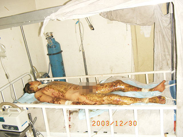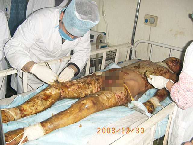 武警四川省消防總隊(duì)醫(yī)院燒傷整形科,自2003年10月采用燒傷濕性醫(yī)療技術(shù)成功救治一例燒傷面積達(dá)80%TBSA的成人大面積深度燒傷后,于2003年12月23日20時(shí)整,又急診收入一例少兒火焰大面積深度燒傷患者。 該患者彭某某,男,16歲,于入院5天前不慎引爆香蕉水桶致香蕉水火焰燒傷,傷后患者被送往四川省人民醫(yī)院燒傷門診救治。該院在傷后6小時(shí)給該患者行氣管切開術(shù),創(chuàng)面處理采用外用藥物(噴霧劑,名稱不詳)干燥暴露,結(jié)合復(fù)蘇補(bǔ)液、抗炎(藥名不詳)等治療,并且該患者因經(jīng)濟(jì)原因于傷后第三天曾放棄治療一天,后于傷后第五天轉(zhuǎn)入武警四川消防總隊(duì)醫(yī)院。