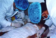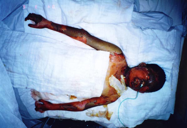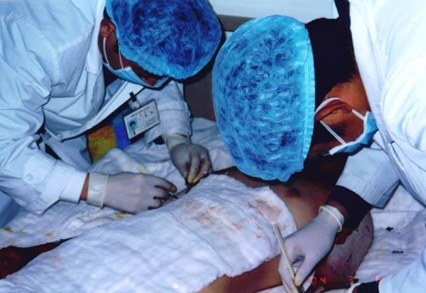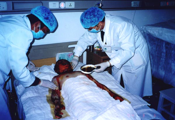 會(huì)后,大理州人民醫(yī)院燒傷科的專家看到燒傷皮膚再生醫(yī)療技術(shù)非常理想的臨床效果,在本次學(xué)術(shù)活動(dòng)剛結(jié)束就邀請(qǐng)王主任到該醫(yī)院為一名正在該院住院的小兒大面積深度燒傷患兒會(huì)診。王主任接到會(huì)診請(qǐng)求后,立即趕到了該院,聽(tīng)取了主治大夫?qū)純旱牟∏榻榻B,并深入病房對(duì)患兒進(jìn)行了細(xì)致的體檢,患兒,女,14歲,于2004年3月3日晚11時(shí),因蠟燭引燃被褥致全身多處被火焰燒傷,傷后7小時(shí)轉(zhuǎn)入大理州人民醫(yī)院燒傷科,入院診斷:1、全身火焰燒傷總面積45%TBSA(深二度25%BSA、三度20%BSA);2、中度吸入性損傷。王主任從對(duì)患兒體檢判斷,該患兒雙上肢基本為三度創(chuàng)面、面部的一部分和雙下肢部分創(chuàng)面也為三度創(chuàng)面,體檢后,王主任親自帶領(lǐng)該病人的主治醫(yī)生給該患兒的雙上肢和面部等三度創(chuàng)面進(jìn)行了無(wú)創(chuàng)性耕耘減張術(shù),并且于清創(chuàng)術(shù)后給患兒創(chuàng)面涂用了美寶濕潤(rùn)燒傷膏,換藥結(jié)束后,王主任還就對(duì)該患兒下一步的創(chuàng)面和全身綜合治療等方面與患兒的主治醫(yī)生進(jìn)行了交流。