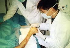 2004年5月17日,應(yīng)藍(lán)天醫(yī)院的邀請(qǐng),中國(guó)燒傷創(chuàng)瘍科技中心陳主任趕到該院,對(duì)此患者進(jìn)行會(huì)診。查房檢查:患者生命體征正常,一般情況良好,心、肺無(wú)異常。創(chuàng)面分布在右手和右前臂,掌側(cè)較淺創(chuàng)面已愈合,前臂背側(cè)創(chuàng)面壞死組織大部分清除干凈,燒傷深達(dá)脂肪深層,部分創(chuàng)面已見新生長(zhǎng)的粉紅色組織,手背仍有部分壞死組織,并有肌腱、指骨壞死,燒傷深度達(dá)骨骼,手指能輕度屈伸,指端血循環(huán)良好,燒傷創(chuàng)面周圍皮膚顏色正常。診斷:右手、右前臂熱壓傷,TBSA=5%,淺II度2%,深I(lǐng)II度3%。查房結(jié)束后,陳主任示范和指導(dǎo)大家進(jìn)行燒傷再生醫(yī)療技術(shù)的創(chuàng)面規(guī)范操作,結(jié)合工作實(shí)踐介紹III度燒傷的治療經(jīng)驗(yàn),制定了下一階段的治療計(jì)劃,同時(shí)向大家做了"患者知情權(quán)"的普法宣傳。大家認(rèn)為要給患者充分的知情權(quán)和選擇權(quán),決心應(yīng)用好再生醫(yī)療技術(shù),給患者一次再生修復(fù)的機(jī)會(huì),減輕患者的痛苦、減少患者的創(chuàng)傷、減少殘疾,造;颊、家庭和社會(huì)。 中國(guó)燒傷創(chuàng)瘍科技中心
