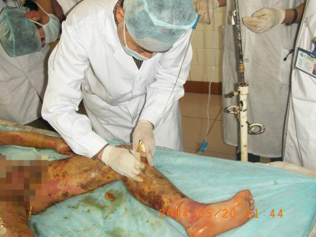 GLO:20g/L。因該患者病情危重,該院特邀請(qǐng)中國燒傷創(chuàng)瘍科技中心臨床總部主任王洪生前來會(huì)診,王主任于2004年5月20日上午11時(shí)趕到該院。王主任到達(dá)該院后,在聽取該患者的經(jīng)治醫(yī)生陳士平副主任醫(yī)師對(duì)該患者的病情介紹后,首先深入病房為該患者進(jìn)行的體檢后,又親自為該患者創(chuàng)面換藥以進(jìn)一步觀察創(chuàng)面情況,當(dāng)日下午3時(shí),王主任又在由該院燒傷外科全體醫(yī)生和護(hù)士長參加的對(duì)該患者的病例討論會(huì)上,對(duì)該患者的診斷進(jìn)行了修正:王主任指出,結(jié)合患者病史、體檢和實(shí)驗(yàn)室檢查等情況,該患者因病情危重及復(fù)合傷,免疫力低下而引發(fā)早期全身膿毒癥,結(jié)合目前患者體溫波動(dòng)于39℃以上,心率127次/分,呼吸32次/分,血培養(yǎng)兩次結(jié)果都有同一細(xì)菌生長,考慮患者全身膿毒癥還未控制,另外,該患者目前存在嚴(yán)重的低蛋白血癥;聽診雙肺呼吸音清晰,未聞干濕性啰音,下一步治療首先要調(diào)整抗生素控制全身膿毒癥,加強(qiáng)營養(yǎng)支持療法,加緊清理前胸和雙下肢Ⅲ度創(chuàng)面壞死組織,加強(qiáng)褥瘡護(hù)理,對(duì)氣管插管先行堵管試驗(yàn),而后盡快拔管以在發(fā)肺部并發(fā)癥,對(duì)深靜脈插管要加強(qiáng)消毒措施,為防導(dǎo)管全身膿毒癥的發(fā)生,必要時(shí)要及時(shí)拔管并更換深靜脈插管部位,病例討論后,王主任又帶領(lǐng)該院燒傷外科的醫(yī)生再次為該患者前胸和雙下肢Ⅲ度創(chuàng)面進(jìn)行清創(chuàng)和換藥,以向他們展示燒傷皮膚再生醫(yī)療技術(shù)中規(guī)范的Ⅲ度創(chuàng)面壞死組織處理技術(shù)-壞死組織薄化技術(shù);當(dāng)日晚上8時(shí),王主任又應(yīng)邀在該院燒傷外科醫(yī)生辦公室利用筆記本電腦圖文并茂的向該院燒傷外科的專家和醫(yī)務(wù)人員講述燒傷皮膚再生醫(yī)療技術(shù)在大面積深度燒傷的臨床應(yīng)用和治療要點(diǎn),并向他們介紹了我國著名生命科學(xué)家、醫(yī)學(xué)家徐榮祥教授近期在再生醫(yī)學(xué)領(lǐng)域所取得的重大臨床和實(shí)驗(yàn)研究成果,同時(shí)還向他們通報(bào)了徐教授主編的"燒傷再生醫(yī)學(xué)與療法"英文版專著,已由世界最著名的醫(yī)學(xué)、生物學(xué)、生命科學(xué)領(lǐng)域的瑞典KARGER出版社正式出版,在世界范圍內(nèi)發(fā)行這一重大喜訊。目前患者正在進(jìn)一步救治療中。