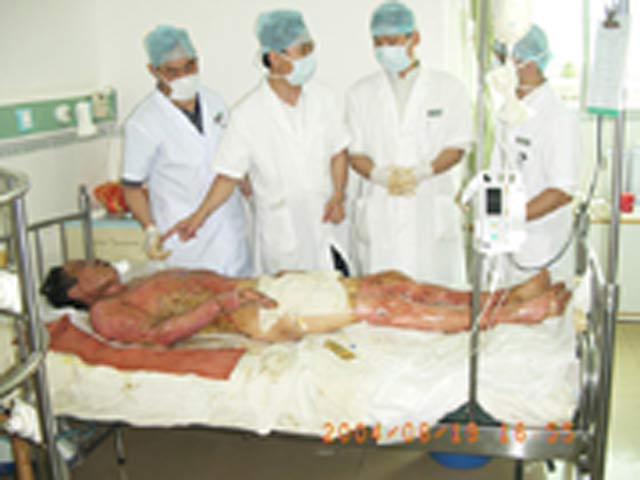 2004年6月10日晚8時30分,廣東省中山市三鄉(xiāng)醫(yī)院燒傷外科急診收入一例成人大面積燒傷患者。該患者男,32歲,以“煤氣罐爆炸燒傷全身多處1小時”為主訴急診入院。患者于入院前1小時,因宿舍內(nèi)煤氣泄露引起煤氣罐爆炸致全身多處燒傷;入院時查體:T:37.3℃,P:100次/分,R:22次/分,BP:120/60mmHg,神清,急性痛苦病容,呻吟不止,煩躁不安,全身多處創(chuàng)面呈黑褐色,滿布油污,部分頭發(fā)、眉毛被燒焦,頭、面、頸、前后軀干大部分及四肢皮膚廣泛水腫,創(chuàng)面散在大小不等的水皰,部分腐皮脫失,創(chuàng)基紅白相間,入院診斷:全身煤氣火焰燒傷總面積80%TBSA(淺二度35%、深二度45%)特重度燒傷;患者入院后,該院對其創(chuàng)面處理全程采用燒傷皮膚再生醫(yī)療技術(shù),結(jié)合抗休克、抗感染、營養(yǎng)支持等全身綜合治療,患者病情基本穩(wěn)定,淺二度創(chuàng)面已愈合,但近日患者開始出現(xiàn)高熱,為確保對該患者的成功救治,該院向中國燒傷創(chuàng)瘍科技中心臨床總部主任王洪生發(fā)出了會診請求,王主任接到會診請求后,于2004年6月19日下午四時趕到該院為該患者會診,到達(dá)該院后,王主任首先聽取了該院燒傷外科主任傅尚凱副教授、副主任醫(yī)師等專家及相關(guān)醫(yī)務(wù)人員對該患者的病情介紹,隨后,王主任又在傅主任等燒傷外科專家和醫(yī)務(wù)人員的陪同下,深入病房為該患者進(jìn)行了詳細(xì)的體檢,并親自為該患者進(jìn)行清創(chuàng)換藥,向該院燒傷外科專家及醫(yī)務(wù)人員展示燒傷皮膚再生醫(yī)療技術(shù)中規(guī)范的清創(chuàng)換藥技術(shù),接下來,在該院燒傷外科醫(yī)生辦公室王主任與該院燒傷外科的全體醫(yī)生就該患者下一步的創(chuàng)面規(guī)范化處理、調(diào)整抗生素以加強(qiáng)抗感染治療、營養(yǎng)支持及臟器功能保護(hù)等全身綜合治療要點(diǎn)進(jìn)行了討論,會診結(jié)束前,王主任還就燒傷皮膚再生醫(yī)療技術(shù)在大面積燒傷中的臨床應(yīng)用、在再生醫(yī)學(xué)領(lǐng)域所取得的重大臨床及實(shí)驗(yàn)研究成果等問題與該院燒傷外科的專家及相關(guān)醫(yī)務(wù)人員進(jìn)行了廣泛而深入的交流。