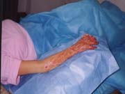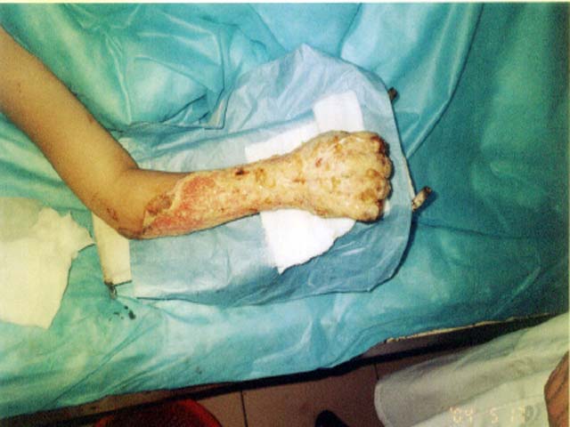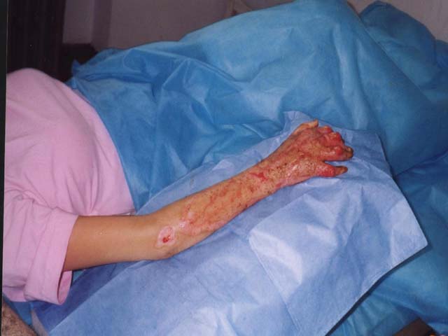 2004年6月29日,應(yīng)用燒傷皮膚再生療法治療第46天,創(chuàng)面封閉,右前臂和手的外形、外觀基本恢復(fù)到受傷前的狀態(tài),肘關(guān)節(jié)、腕關(guān)節(jié)功能恢復(fù)正常,各指關(guān)節(jié)、掌指關(guān)節(jié)也能做小范圍的曲伸運(yùn)動(dòng),F(xiàn)在患者已進(jìn)入功能鍛煉、功能康復(fù)和綜合預(yù)防疤痕增生治療階段;颊摺⒓覍俸蛦挝粚(duì)治療結(jié)果非常滿(mǎn)意。 中國(guó)燒傷創(chuàng)瘍科技中心臨床部