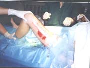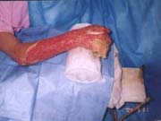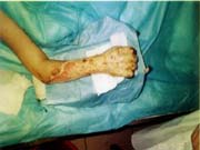 2004年5月31日,經(jīng)過(guò)18天(傷后27天)燒傷再生醫(yī)療技術(shù)的創(chuàng)面規(guī)范處理,創(chuàng)面壞死組織基本實(shí)現(xiàn)了無(wú)損傷性液化排除,大部分創(chuàng)面被新生肉芽組織覆蓋。但是,由于燒傷深度非常深,淺層壞死組織液化清除后,食指、中指、無(wú)名指、小指的伸肌腱外露并有壞死的表現(xiàn),掌骨、指骨、掌指關(guān)節(jié)、指間關(guān)節(jié)外露,由此可以看出該創(chuàng)面的損傷非常深而且很?chē)?yán)重?萍贾行牡年愔魅卧俅蝸(lái)到該院,制定了創(chuàng)面處理原則:1、給創(chuàng)面創(chuàng)造生理濕潤(rùn)環(huán)境,保護(hù)外露的肌腱、骨骼和關(guān)節(jié);2、供給充足的營(yíng)養(yǎng)物質(zhì)和生命再生物質(zhì),盡最大可能挽救間生態(tài)組織,實(shí)現(xiàn)肌腱、關(guān)節(jié)囊再生;3、促進(jìn)周?chē)掀ず蛙浗M織的生長(zhǎng),覆蓋裸露的骨骼、肌腱和關(guān)節(jié)腔,為下一階段有必要做的皮膚移植創(chuàng)造條件.
